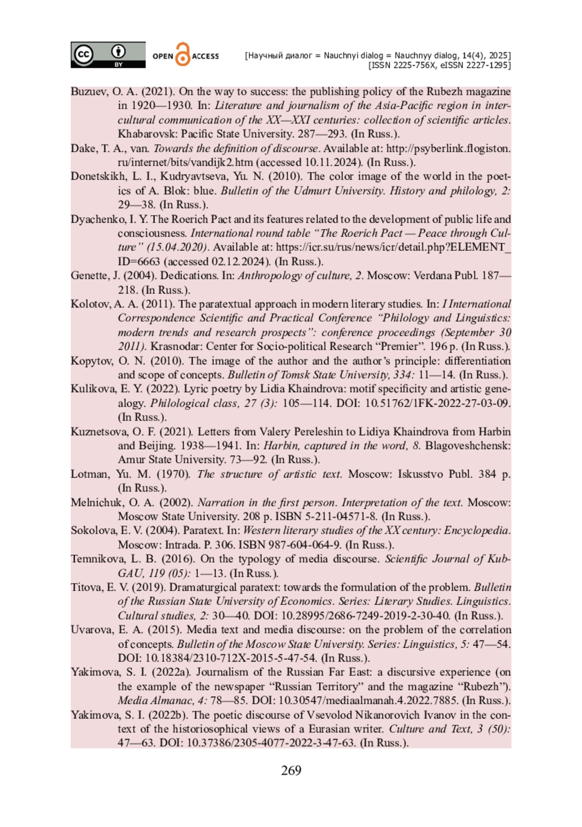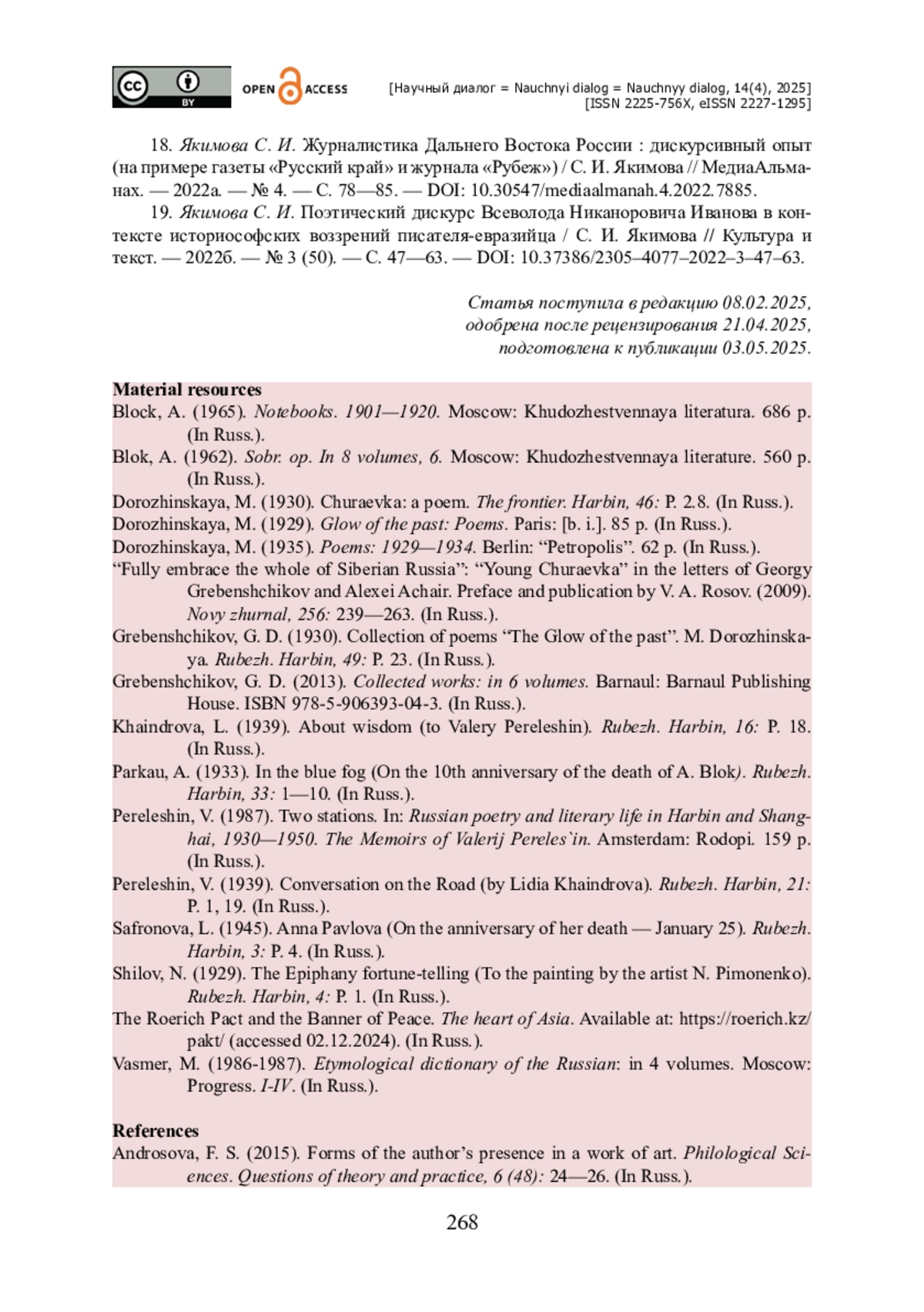 18. Якимова С. И. Журналистика Дальнего Востока России : дискурсивный опыт (на примере газеты «Русский край» и журнала «Рубеж») / С. И. Якимова // МедиаАльманах. - 2022а. - № 4. - С. 78-85. - https://doi.org/10.30547/mediaalmanah.4.2022.7885.