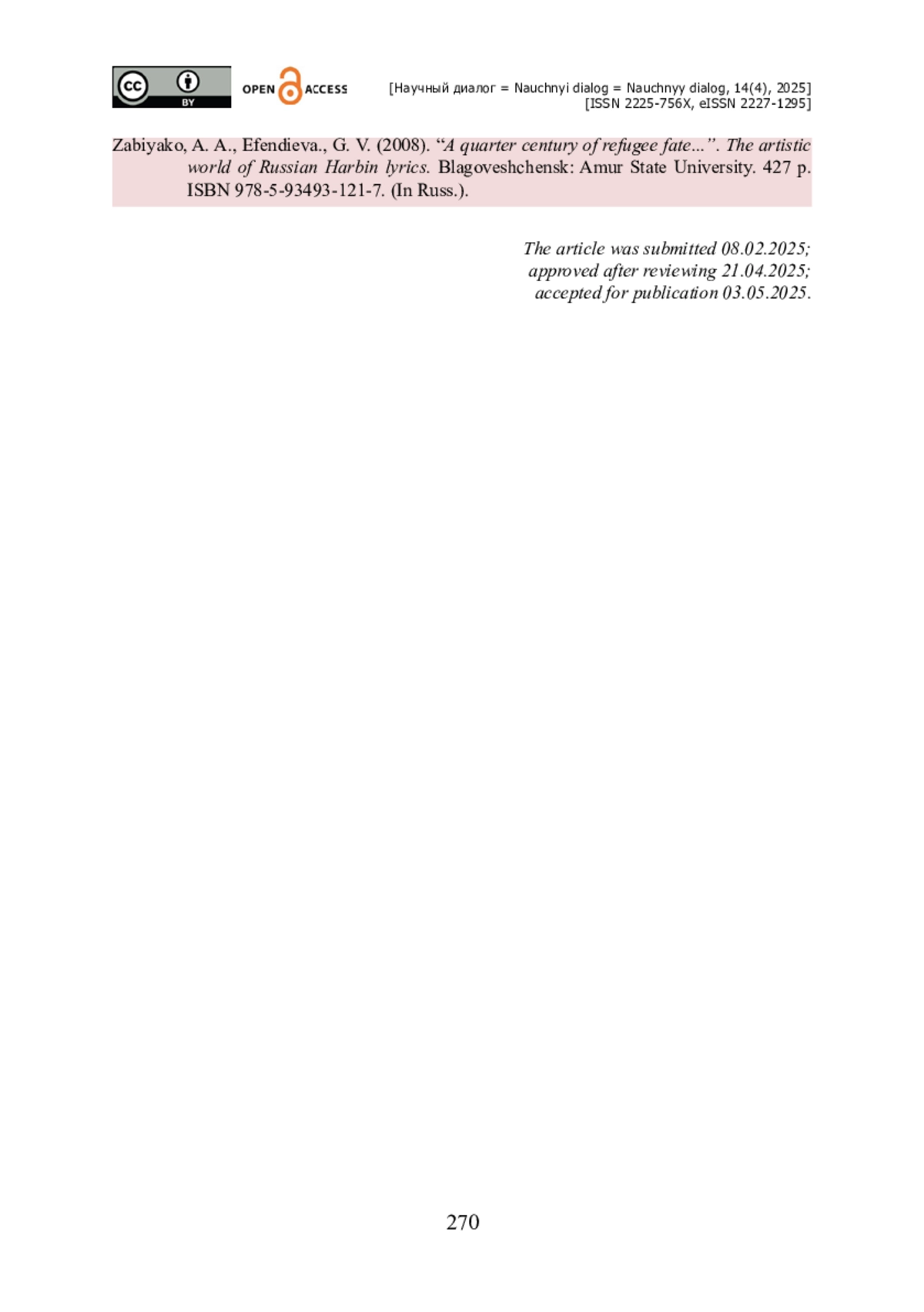 7. Забияко А. А. «Четверть века беженской судьбы…». Художественный мир лирики русского Харбина / А. А. Забияко, Г. В. Эфендиева. - Благовещенск : Амур. гос. ун-т, 2008. - 427 с. - ISBN 978-5-93493-121-7.