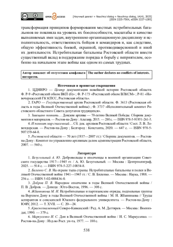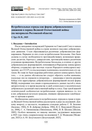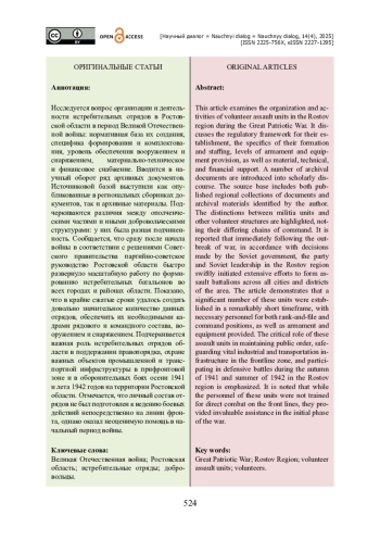 Исследуется вопрос организации и деятельности истребительных отрядов в Ростовской области в период Великой Отечественной войны: нормативная база их создания, специфика формирования и комплектования, уровень обеспечения вооружением и снаряжением, материально-техническое и финансовое снабжение. Вводится в научный оборот ряд архивных документов. Источниковой базой выступили как опубликованные в региональных сборниках документов, так и архивные материалы. Подчеркиваются различия между ополченческими частями и иными добровольческими структурами: у них была разная подчиненность. Сообщается, что сразу после начала войны в соответствии с решениями Советского правительства партийно-советское руководство Ростовской области быстро развернуло масштабную работу по формированию истребительных батальонов во всех городах и районах области. Показано, что в крайне сжатые сроки удалось создать довольно значительное количество данных отрядов, обеспечить их необходимыми кадрами рядового и командного состава, вооружением и снаряжением. Подчеркивается важная роль истребительных отрядов области в поддержании правопорядка, охране важных объектов промышленной и транспортной инфраструктуры в прифронтовой зоне и в оборонительных боях осени 1941 и лета 1942 годов на территории Ростовской области. Отмечается, что личный состав отрядов не был подготовлен к ведению боевых действий непосредственно на линии фронта, однако оказал неоценимую помощь в начальный период войны.
