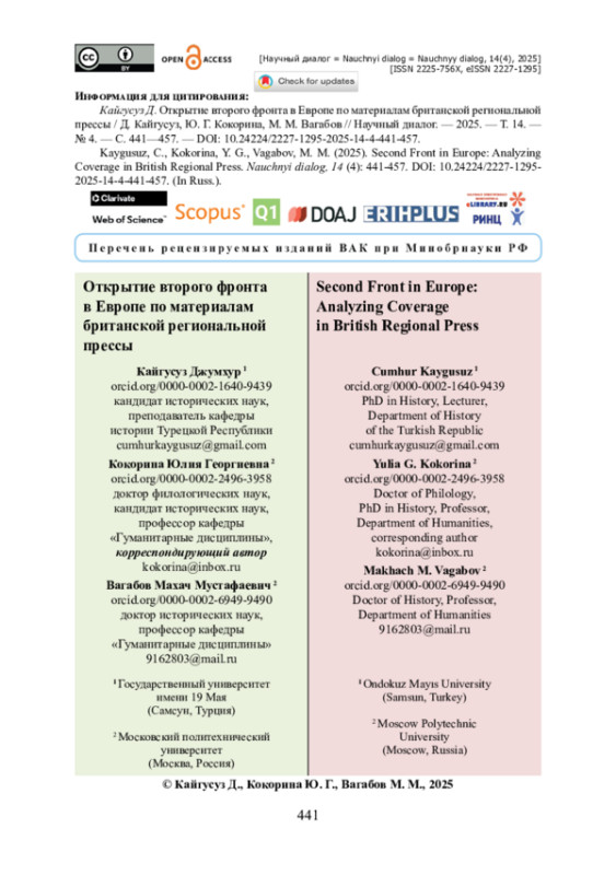 КАЙГУСУЗ Д., КОКОРИНА Ю. Г., ВАГАБОВ М. М. ОТКРЫТИЕ ВТОРОГО ФРОНТА В ЕВРОПЕ ПО МАТЕРИАЛАМ БРИТАНСКОЙ РЕГИОНАЛЬНОЙ ПРЕССЫ // НАУЧНЫЙ ДИАЛОГ. 2025. ТОМ 14, № 4