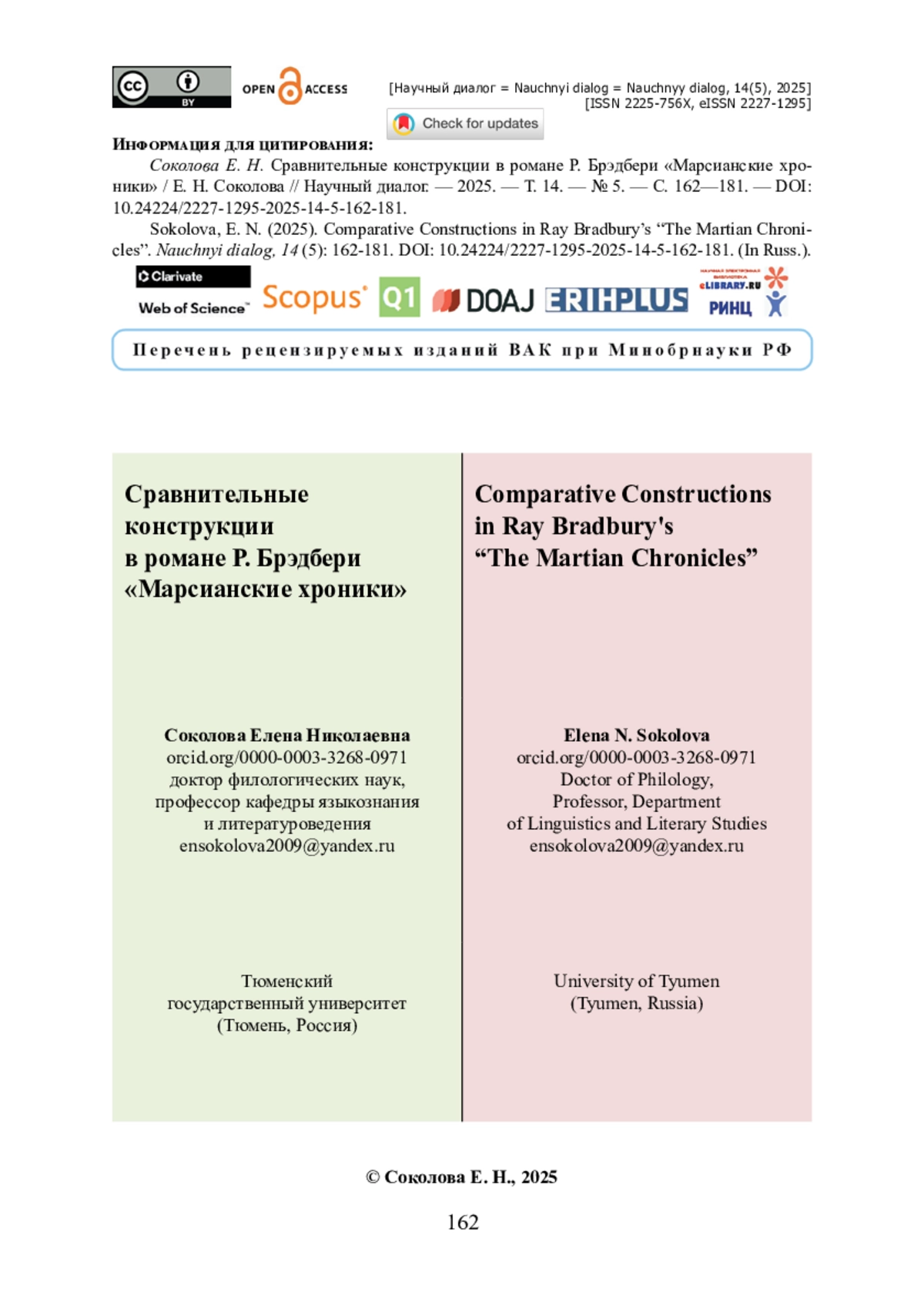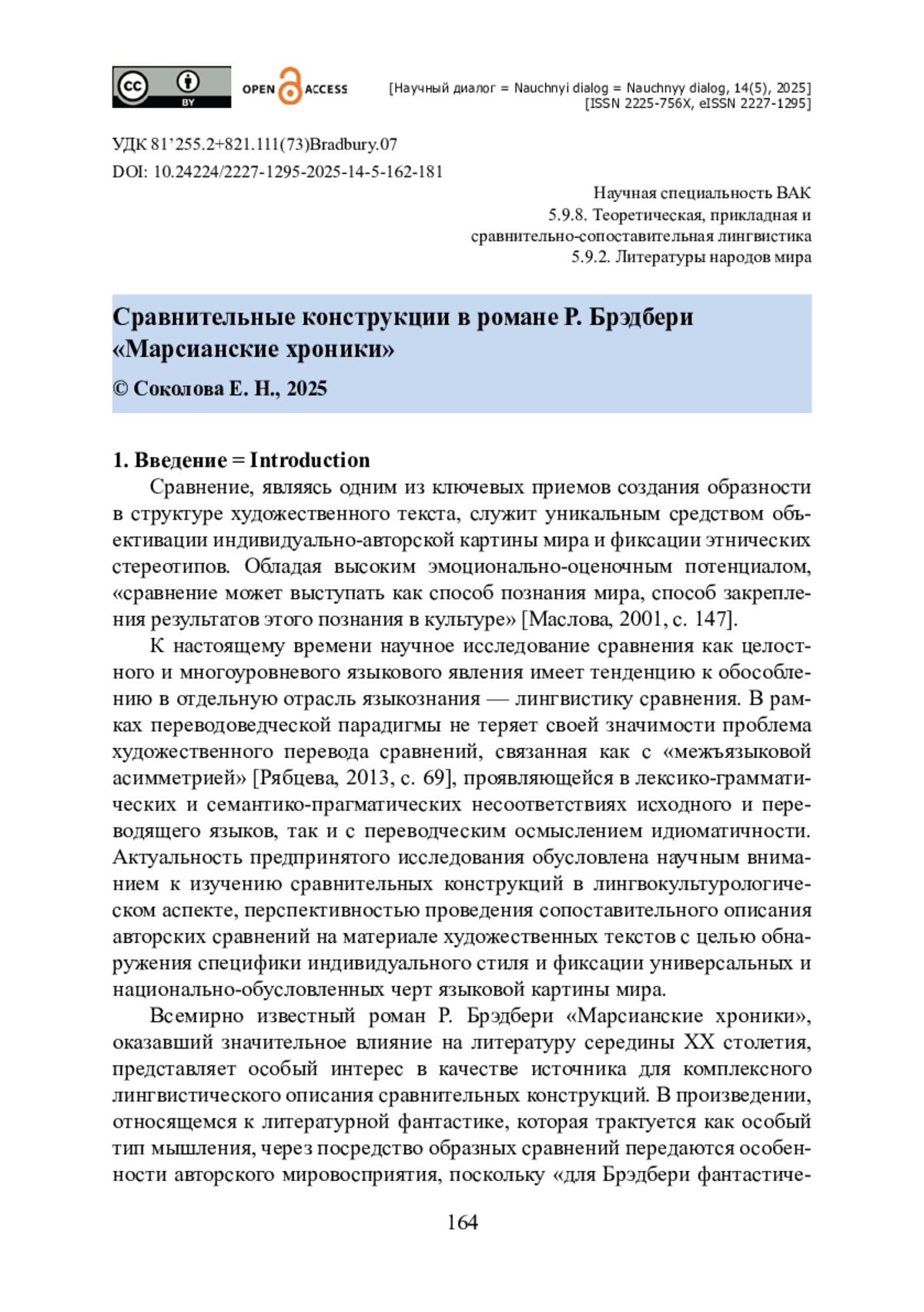 Целью исследования является комплексный анализ сравнений в контексте индивидуально-авторского стиля. Источниками исследования послужили оригинальный текст романа Р. Брэдбери «Марсианские хроники» и его перевод на русский язык Л. Л. Жданова. Материалом исследования стали 354 параллельных текстовых фрагмента, включающих сравнительные конструкции. Применяются методы сопоставительного, контекстуального и компонентного анализа, лингвокультурологического комментирования и количественной характеристики. Установлено, что в русском переводе «Марсианских хроник» Л. Л. Жданова представлено 180 случаев эквивалентного перевода сравнений и 64 примера перевода сравнительных оборотов с применением различного рода трансформаций (генерализация, конкретизация, модуляция, лексическое добавление, компрессия, описательный перевод). Уделяется внимание фиксации в сравнениях универсальных и национально-обусловленных черт языковой картины мира. Доказано, что и субъектами, и объектами сравнения в контексте авторского мировосприятия Р. Брэдбери становятся человек, артефакт, природа. Выявленные модели иллюстрируются примерами: кисти рук — сосульки; лицо — яблоко; женщины — медведицы (ЧЕЛОВЕК > ПРИРОДА); жилища — змеи; город — ящерица; ружья — журавли; корабли — лепестки; воротник — цветок (АРТЕФАКТ > ПРИРОДА) и др. Отмечено 80 примеров отсутствия сравнения в оригинале при его наличии в переводе и 10 случаев отсутствия сравнительной конструкции в переводе при ее наличии в оригинале.