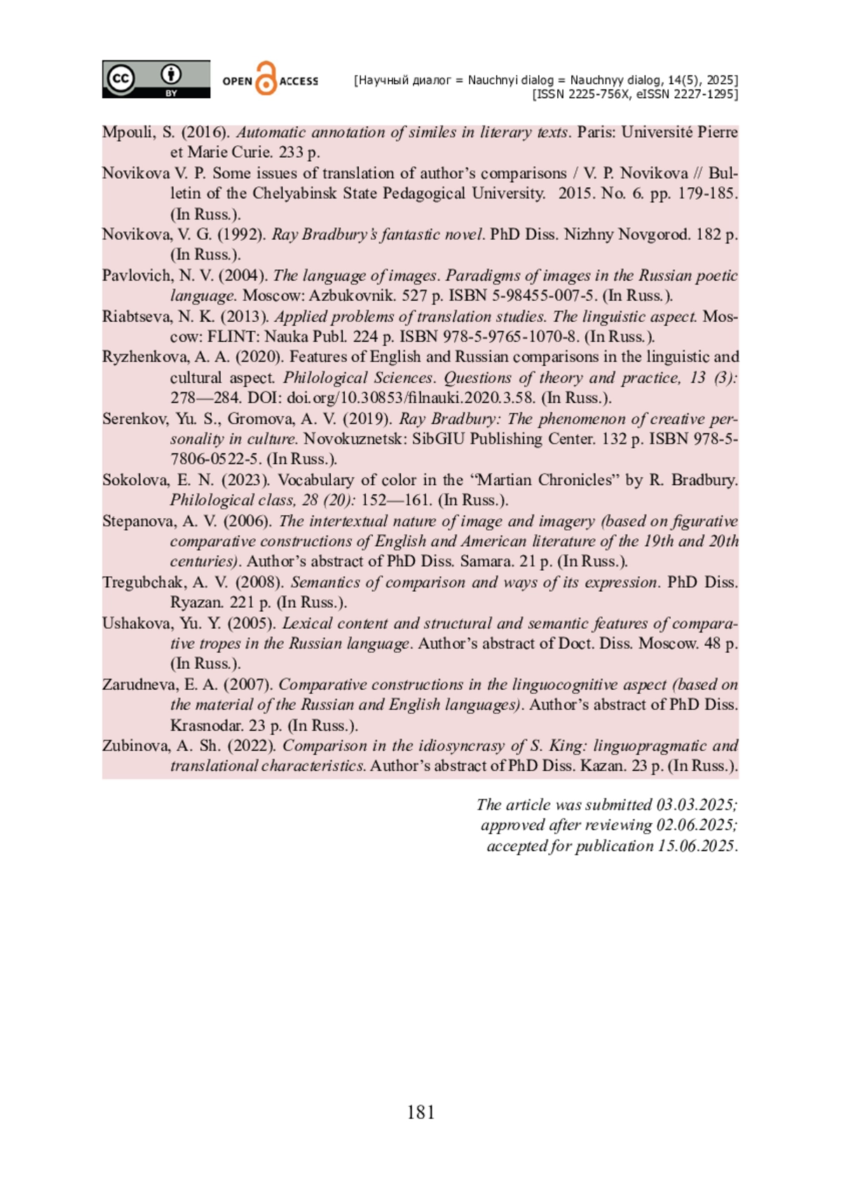 5. Лапина Л. Г. Перевод образных сравнений (на материале перевода повести Рэя Брэдбери «Вино из одуванчиков» на русский язык) / Л. Г. Лапина // Гуманитарные исследования. История и филология. - 2023. - № 9. - С. 59-74. - https://doi.org/10.24412/2713-0231-2023-9-059-073.