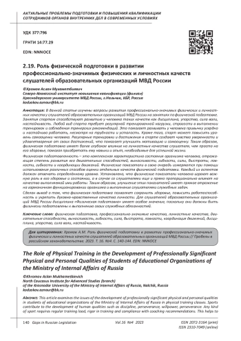 Khazhirokov V.A. Organization and improvement of physical training skills of students studying in universities of the Ministry of Internal Affairs of Russia // Education. The science. Scientific personnel. 2019. No. 1. pp. 203-205. EDN: VXELFO