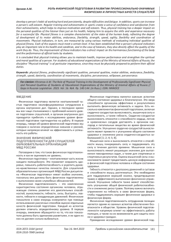 В данной статье изучены ключевые аспекты, способствующие совершенствованию профессионально важных физических качеств у обучающегося контингента слушателей - сотрудников ОВД на занятиях по физической подготовке посредством упражнений из физической культуры и занятий спортом. Профессионально важными физическими качествами являются те качества, которые напрямую влияют на успешное выполнение поставленных перед полицейским служебных задач. А именно такие показатели как сила, выносливость, гибкость, ловкость и быстрота. Как показывает практика и требования, предъявляемые к сотрудникам ОВД, физическая подготовка, несомненно, важна и стоит неким особняком. Однако, существующая методика и некоторые системы, которые чаще всего используемые преподавателями, направлены на формировании минимальных физических показателей, которые являются своеобразным порогом входа для прохождения обучения и освоения различных приемов и движений. Но этого не всегда достаточно, так как в профессиональной деятельности правоохранителям приходится сталкиваться с различными ситуациями, которые не позволяют преподавателям прибегая к классическим методам подготовить слушателей. Установлено, что физическая культура и спорт являются основой любой методики, которая используется при физической подготовке слушателей в стенах образовательных организаций. Спорт в том числе оказывает сильное влияние и на психологическую подготовку слушателей. Ввиду специфики контингента, преподаватели физической подготовки отдают предпочтение различным игровым видам спорта. Эти виды спорта включают командные игры, такие как футбол, баскетбол, волейбол, а также индивидуальные игры, такие как теннис, настольный теннис, бадминтон, и др. Игровые виды спорта способствуют улучшению кардиоваскулярной системы, улучшению дыхательных функций, повышению уровня энергии и повышению настроения. Сделан вывод о том, что физическая культура и спорт являются важнейшими элементами поддержания здорового образа жизни. Упражнения и занятия спортом позволяют поддерживать физическую форму, укреплять сердечно-сосудистую систему и организм в целом.