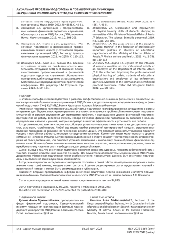 2. Дадов А.В., Губжоков А.Х. Актуальные вопросы боевой и физической подготовки сотрудников полиции: основные требования к профессиональным качествам // Современное общество и власть. 2017. № 3 (13). С. 85-89. EDN: ZWQPLZ