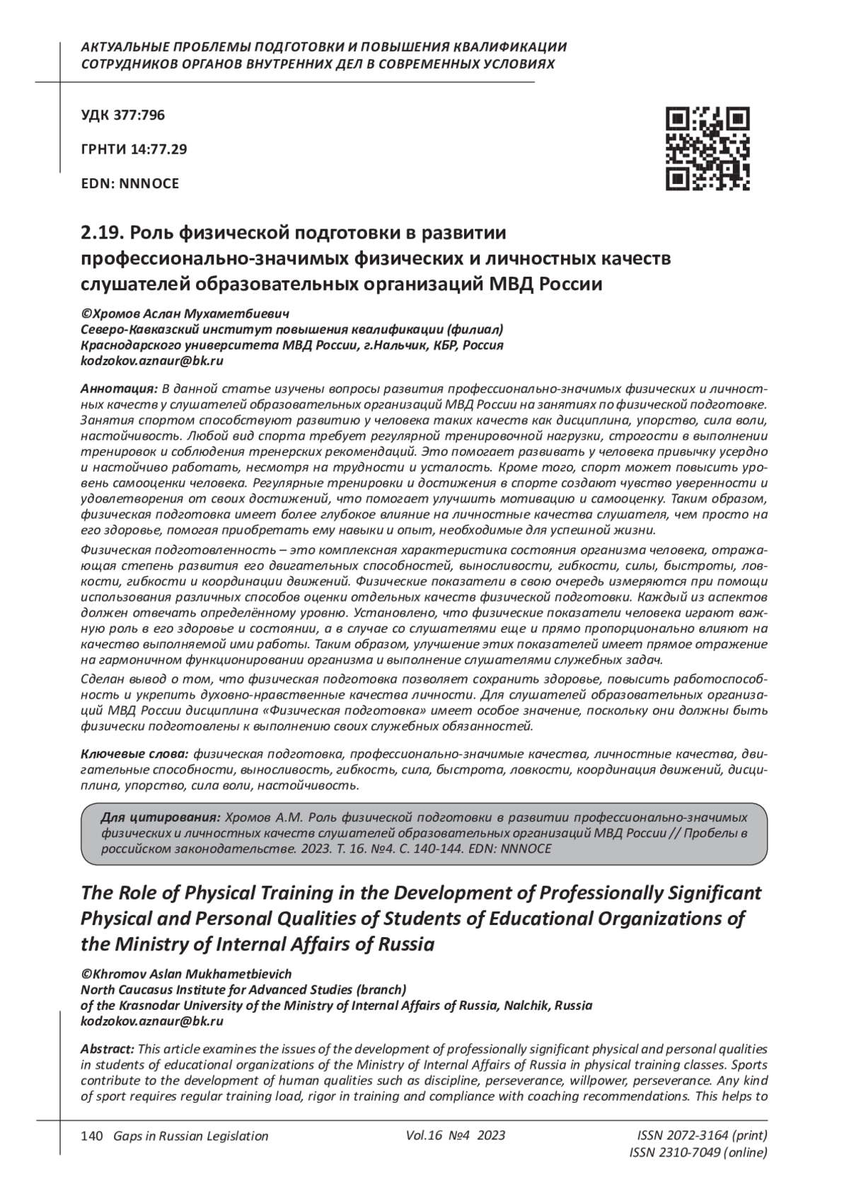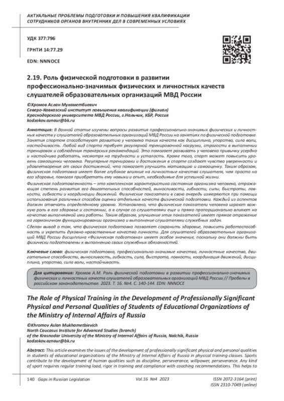 Khazhirokov V.A. The place and role of the discipline “Physical training” in the formation of professionally important qualities in students of educational organizations of the Ministry of Internal Affairs of Russia // Physical culture and health. 2021. No. 2 (78). pp. 110-112. EDN: YYZGGS