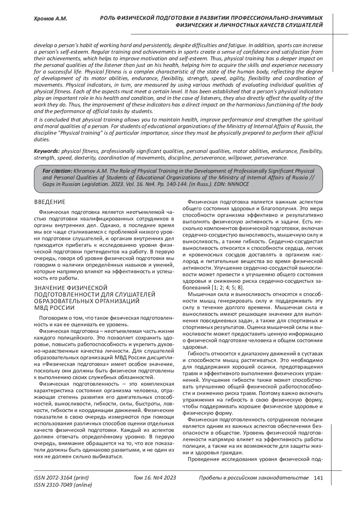 3. Кодзоков А.Х. Совершенствование профессионально-значимых двигательных навыков слушателей образовательных организаций МВД России в процессе физической подготовки // Пробелы в российском законодательстве. 2021. Т. 14. № 4. С. 91-94. EDN: HMGNHI