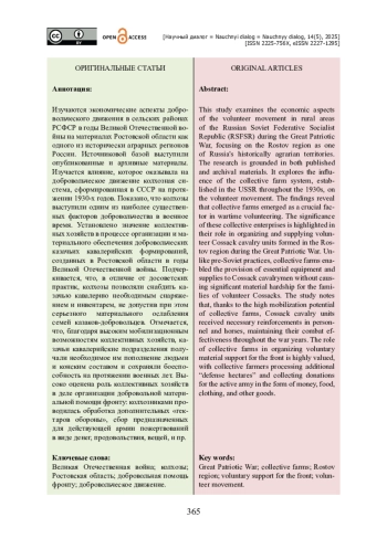 Изучаются экономические аспекты добровольческого движения в сельских районах РСФСР в годы Великой Отечественной войны на материалах Ростовской области как одного из исторически аграрных регионов России. Источниковой базой выступили опубликованные и архивные материалы. Изучается влияние, которое оказывала на добровольческое движение колхозная система, сформированная в СССР на протяжении 1930-х годов. Показано, что колхозы выступили одним из наиболее существенных факторов добровольчества в военное время. Установлено значение коллективных хозяйств в процессе организации и материального обеспечения добровольческих казачьих кавалерийских формирований, созданных в Ростовской области в годы Великой Отечественной войны. Подчеркивается, что, в отличие от досоветских практик, колхозы позволяли снабдить казачью кавалерию необходимым снаряжением и инвентарем, не допустив при этом серьезного материального ослабления семей казаков-добровольцев. Отмечается, что, благодаря высоким мобилизационным возможностям коллективных хозяйств, казачьи кавалерийские подразделения получали необходимое им пополнение людьми и конским составом и сохраняли боеспособность на протяжении военных лет. Высоко оценена роль коллективных хозяйств в деле организации добровольной материальной помощи фронту: колхозниками про водилась обработка дополнительных «гектаров обороны», сбор предназначенных для действующей армии пожертвований в виде денег, продовольствия, вещей, и пр.