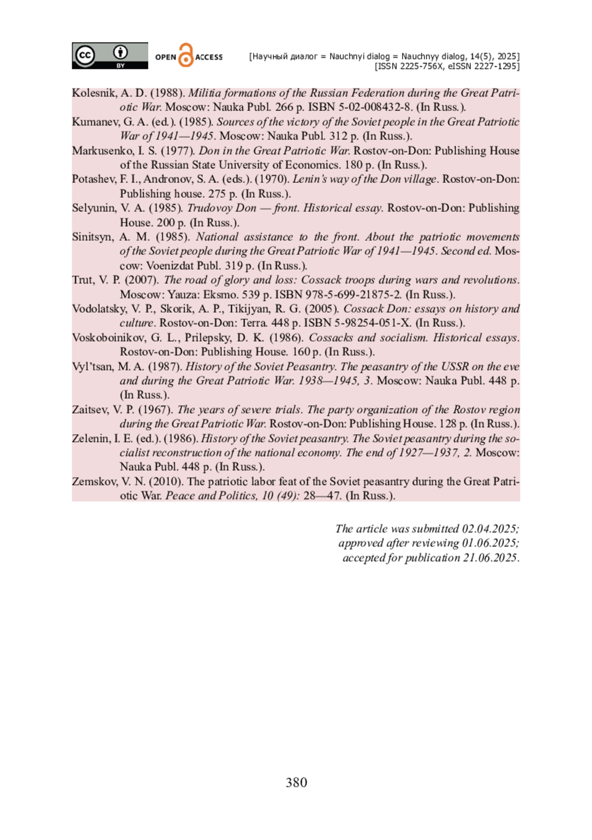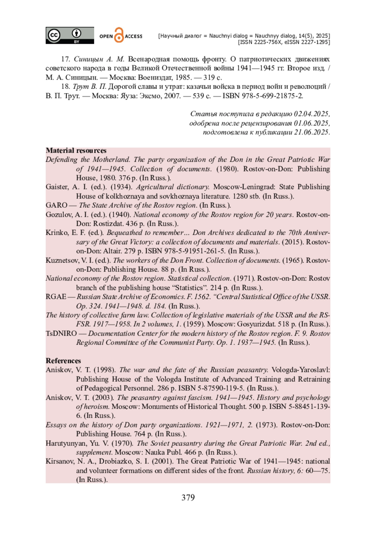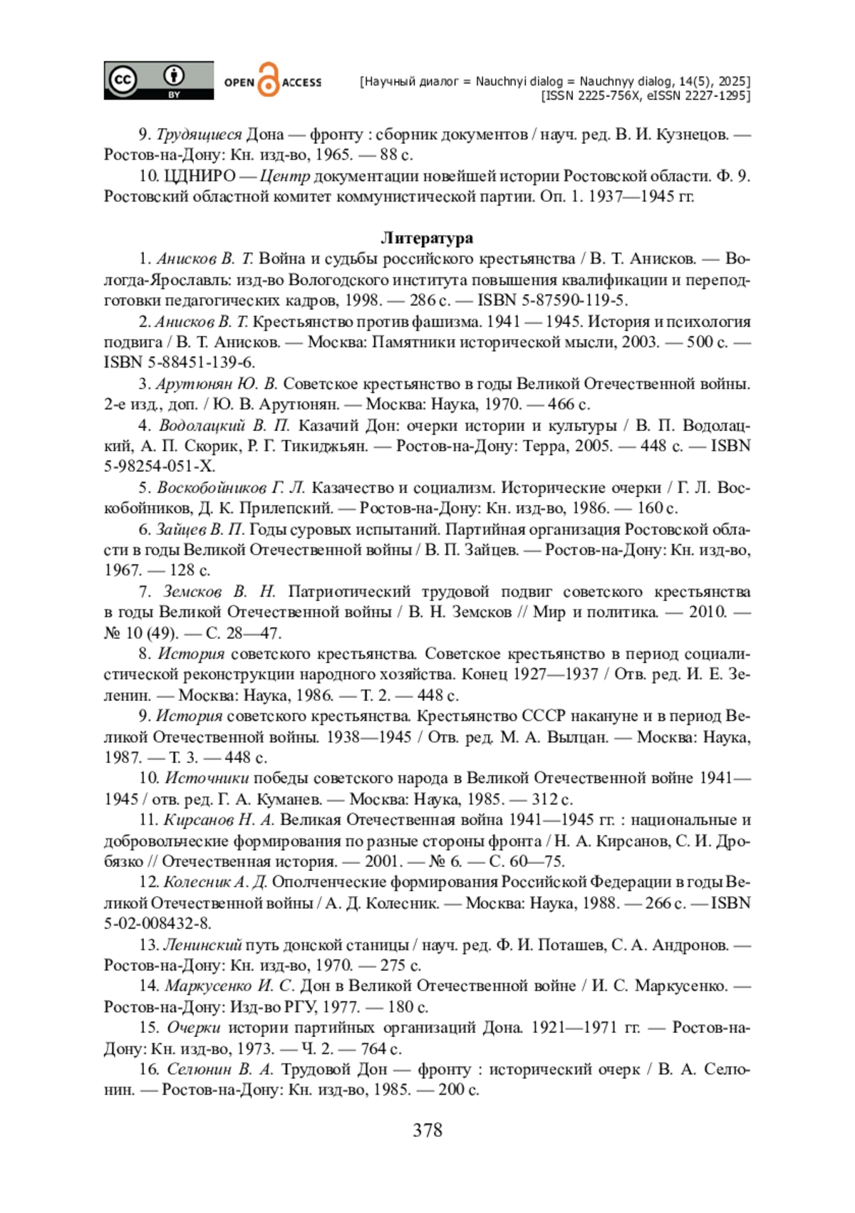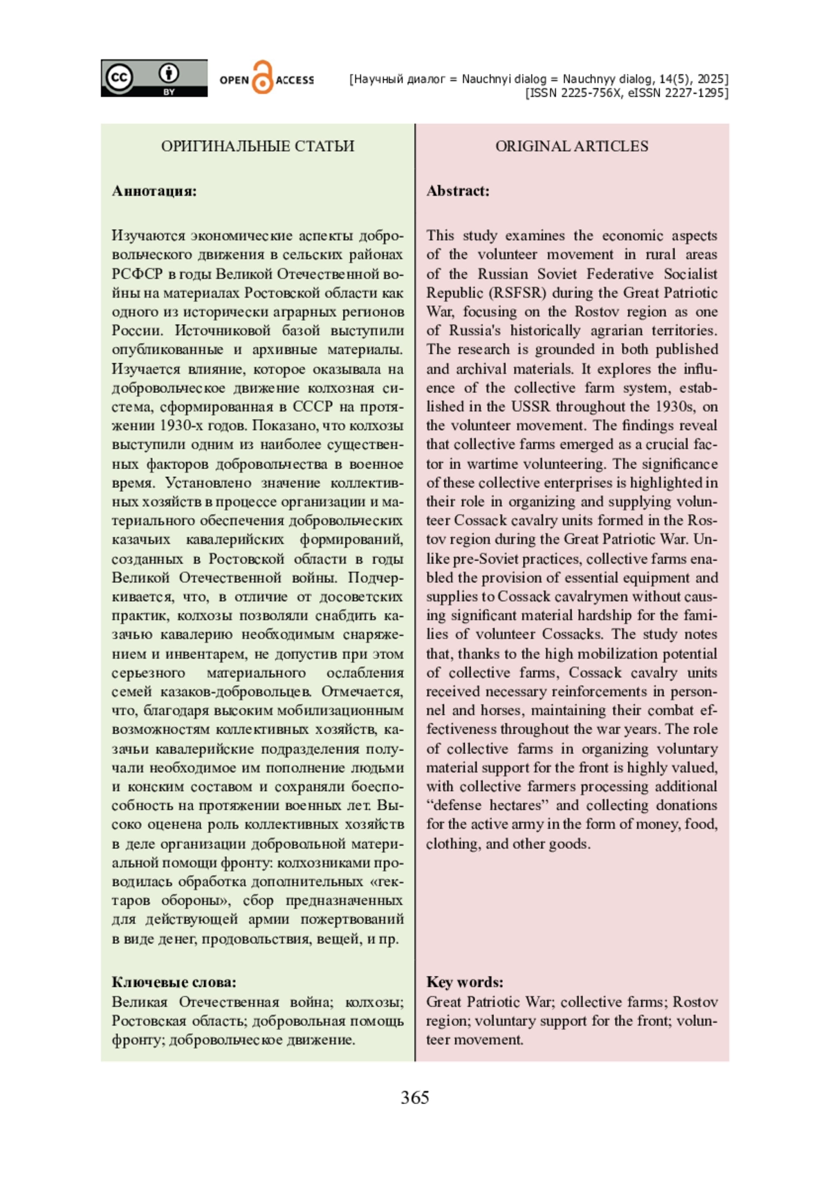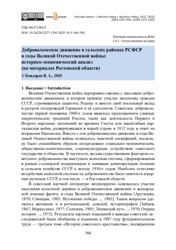 БОНДАРЕВ В. А. ДОБРОВОЛЬЧЕСКОЕ ДВИЖЕНИЕ В СЕЛЬСКИХ РАЙОНАХ РСФСР В ГОДЫ ВЕЛИКОЙ ОТЕЧЕСТВЕННОЙ ВОЙНЫ: ИСТОРИКО-ЭКОНОМИЧЕСКИЙ АНАЛИЗ (НА МАТЕРИАЛАХ РОСТОВСКОЙ ОБЛАСТИ) // НАУЧНЫЙ ДИАЛОГ. 2025. ТОМ 14, № 5