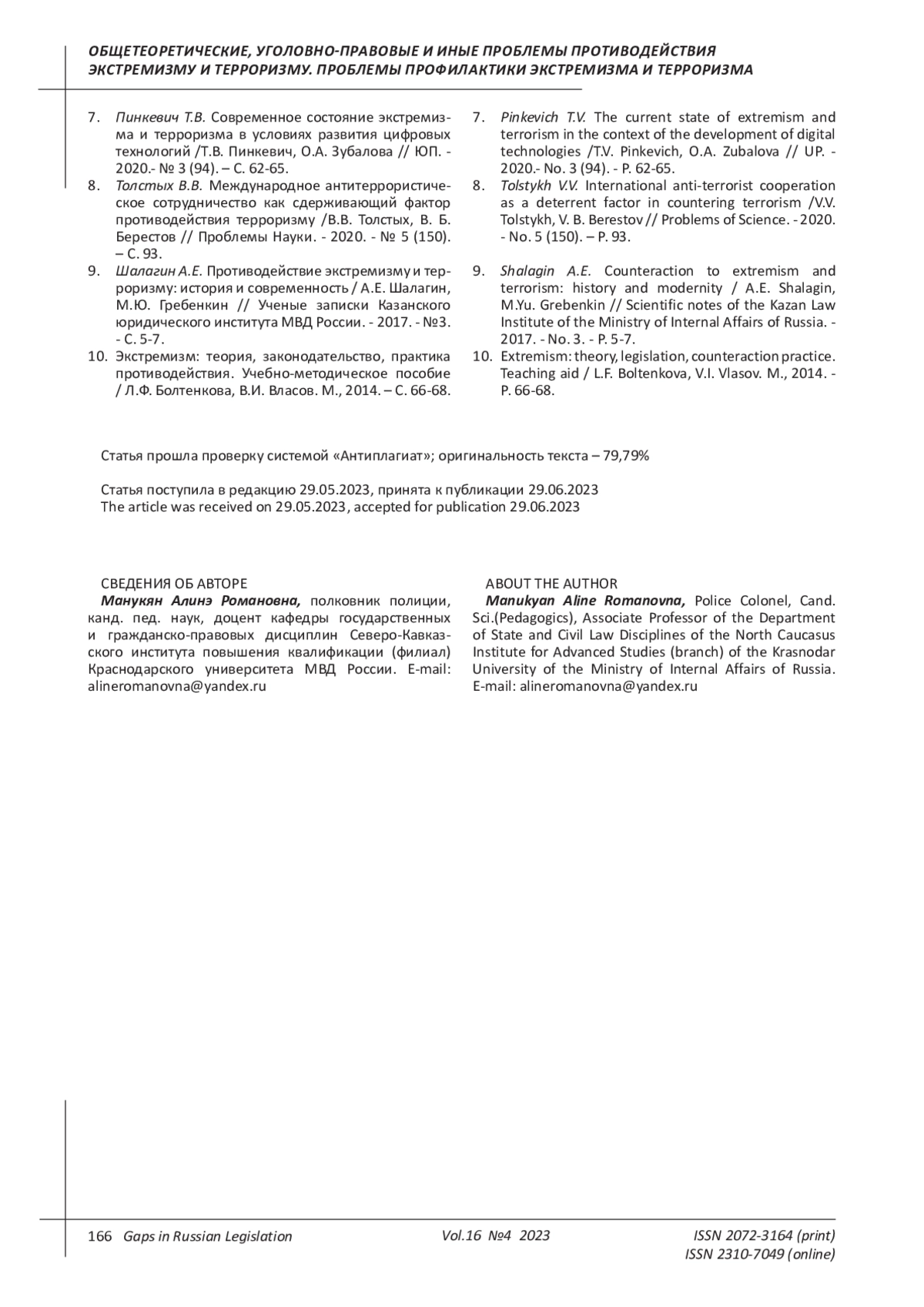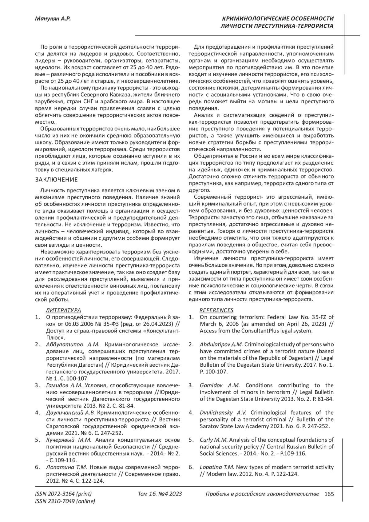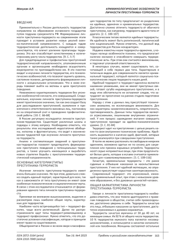 МАНУКЯН А. Р. КРИМИНОЛОГИЧЕСКИЕ ОСОБЕННОСТИ ЛИЧНОСТИ ПРЕСТУПНИКА-ТЕРРОРИСТА // ПРОБЕЛЫ В РОССИЙСКОМ ЗАКОНОДАТЕЛЬСТВЕ. 2023. Т. 16 № 4