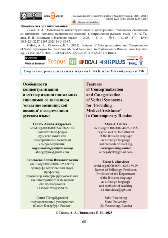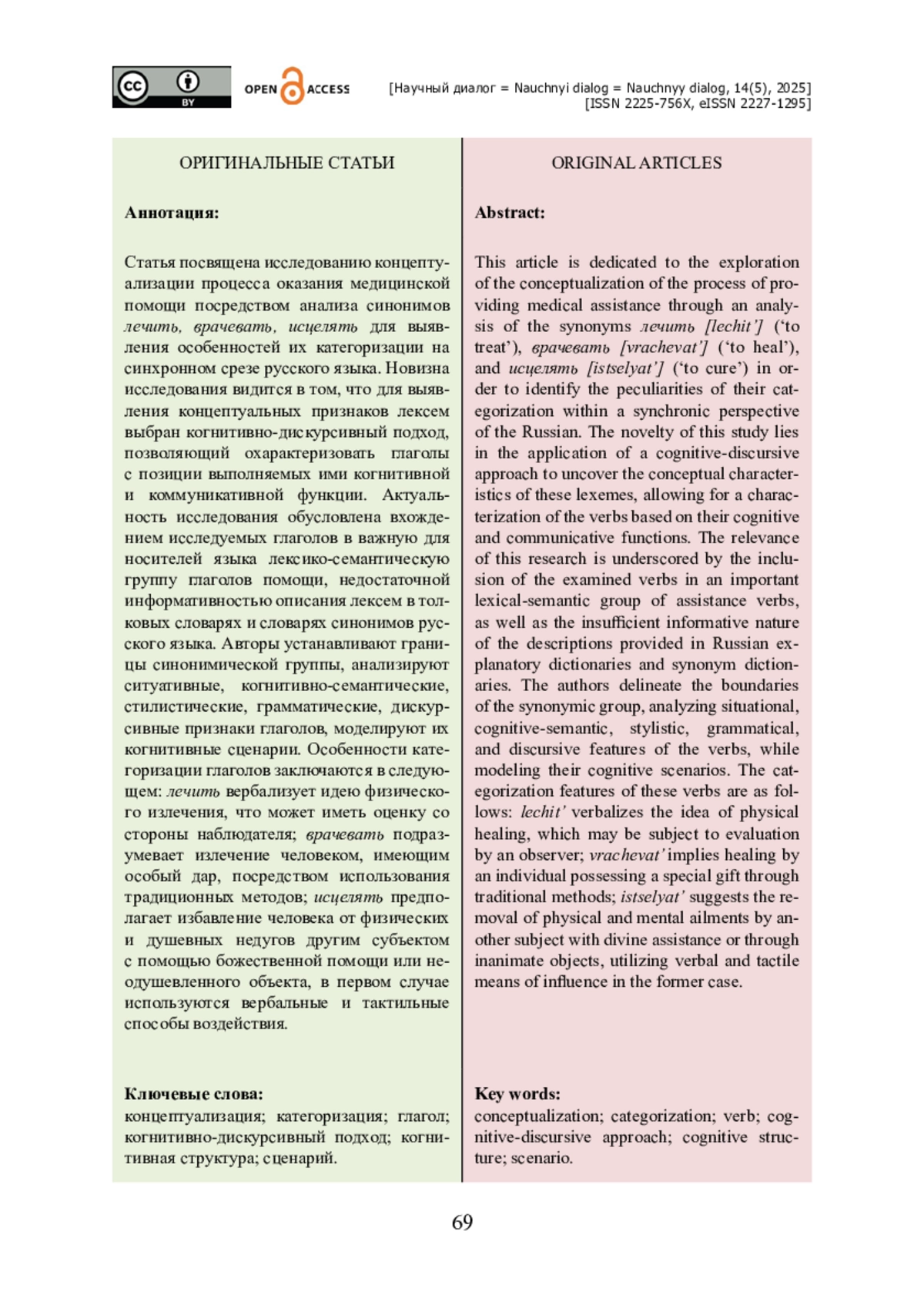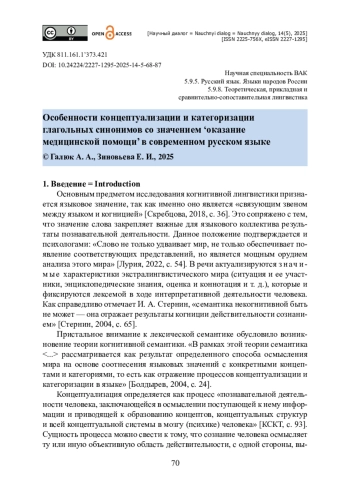 Статья посвящена исследованию концептуализации процесса оказания медицинской помощи посредством анализа синонимов лечить, врачевать, исцелять для выявления особенностей их категоризации на синхронном срезе русского языка. Новизна исследования видится в том, что для выявления концептуальных признаков лексем выбран когнитивно-дискурсивный подход, позволяющий охарактеризовать глаголы с позиции выполняемых ими когнитивной и коммуникативной функции. Актуальность исследования обусловлена вхождением исследуемых глаголов в важную для носителей языка лексико-семантическую группу глаголов помощи, недостаточной информативностью описания лексем в толковых словарях и словарях синонимов русского языка. Авторы устанавливают границы синонимической группы, анализируют ситуативные, когнитивно-семантические, стилистические, грамматические, дискурсивные признаки глаголов, моделируют их когнитивные сценарии. Особенности категоризации глаголов заключаются в следующем: лечить вербализует идею физического излечения, что может иметь оценку со стороны наблюдателя; врачевать подразумевает излечение человеком, имеющим особый дар, посредством использования традиционных методов; исцелять предполагает избавление человека от физических и душевных недугов другим субъектом с помощью божественной помощи или неодушевленного объекта, в первом случае используются вербальные и тактильные способы воздействия.
