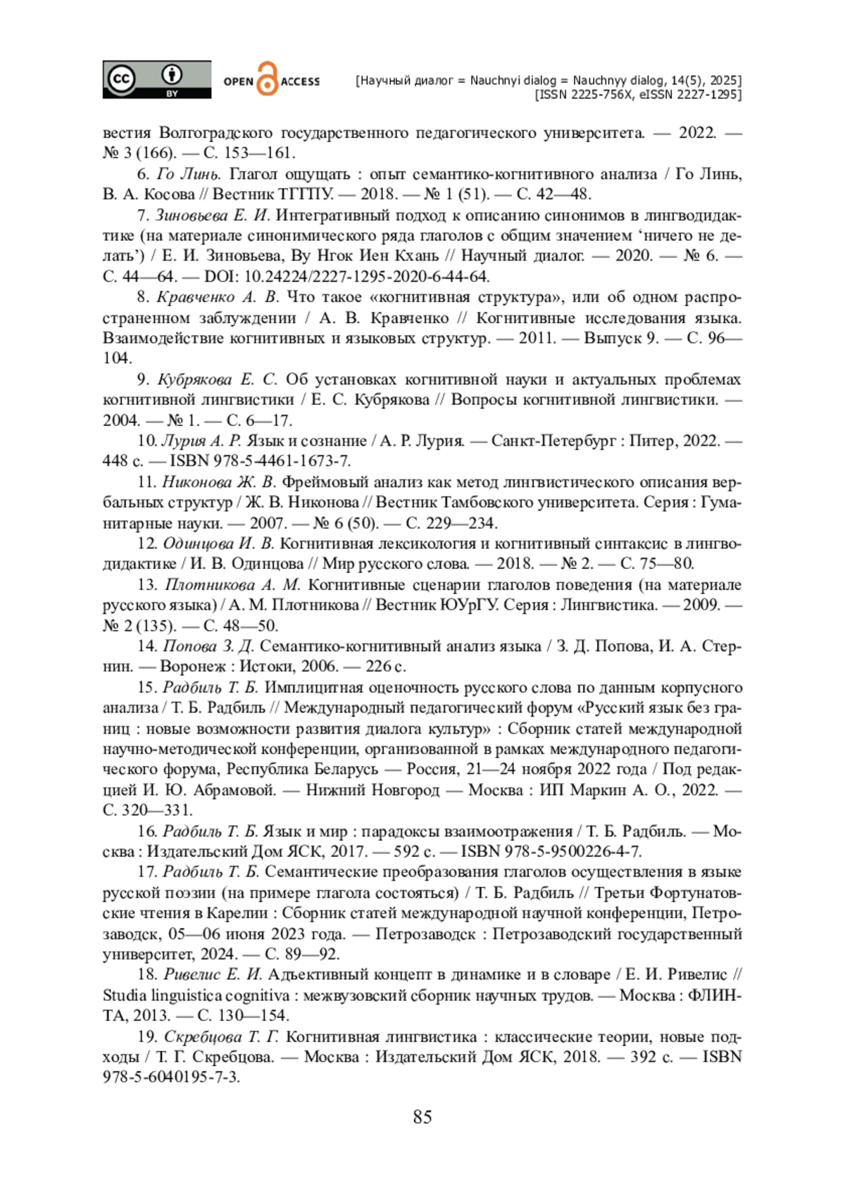 12. Одинцова И. В. Когнитивная лексикология и когнитивный синтаксис в лингводидактике / И. В. Одинцова // Мир русского слова. - 2018. - № 2. - С. 75-80.