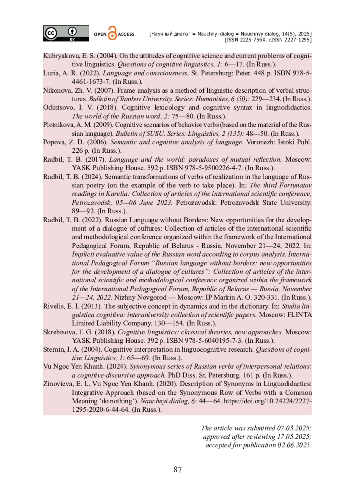 11. Никонова Ж. В. Фреймовый анализ как метод лингвистического описания вербальных структур / Ж. В. Никонова // Вестник Тамбовского университета. Серия : Гуманитарные науки. - 2007. - № 6 (50). - С. 229-234.