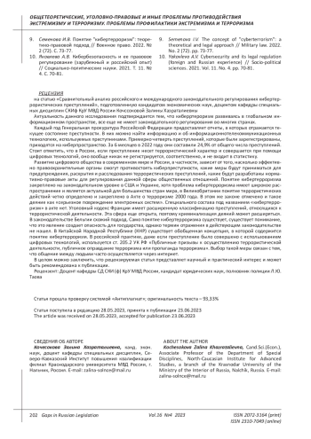 Kuleshova G.P., Kapitonova E.A., Romanovsky G.B. Legal foundations of countering cyberterrorism in Russia and abroad from the perspective of socio-political dimension // All-Russian Criminological Journal. 2020. Vol. 14. No. 1. pp. 156-165. EDN: GMWAWG