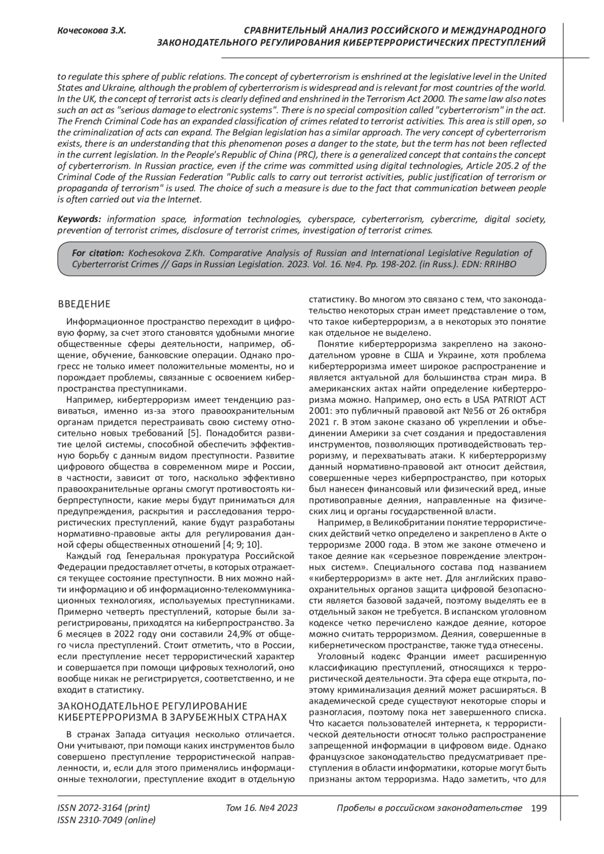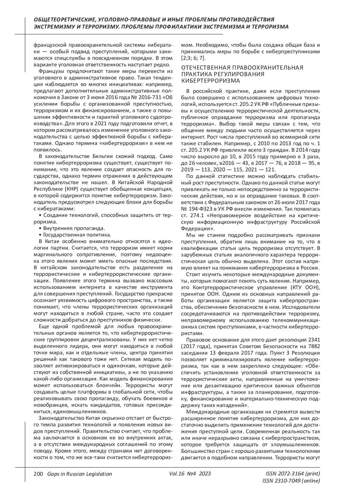 6. Кулешова Г.П., Капитонова Е.А., Романовский Г.Б. Правовые основы противодействия кибертерроризму в России и за рубежом с позиции общественно-политического измерения // Всероссийский криминологический журнал. 2020. Т. 14. № 1. С. 156-165. EDN: GMWAWG