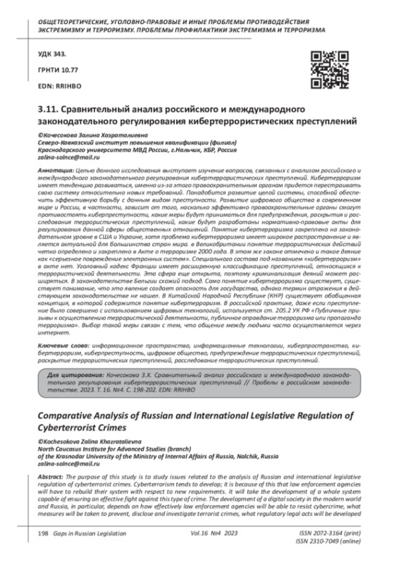 Целью данного исследования выступает изучение вопросов, связанных с анализом российского и международного законодательного регулирования кибертеррористических преступлений. Кибертерроризм имеет тенденцию развиваться, именно из-за этого правоохранительным органам придется перестраивать свою систему относительно новых требований. Понадобится развитие целой системы, способной обеспечить эффективную борьбу с данным видом преступности. Развитие цифрового общества в современном мире и России, в частности, зависит от того, насколько эффективно правоохранительные органы смогут противостоять киберпреступности, какие меры будут приниматься для предупреждения, раскрытия и расследования террористических преступлений, какие будут разработаны нормативно-правовые акты для регулирования данной сферы общественных отношений. Понятие кибертерроризма закреплено на законодательном уровне в США и Украине, хотя проблема кибертерроризма имеет широкое распространение и является актуальной для большинства стран мира. в Великобритании понятие террористических действий четко определено и закреплено в Акте о терроризме 2000 года. В этом же законе отмечено и такое деяние как «серьезное повреждение электронных систем». Специального состава под названием «кибертерроризм» в акте нет. Уголовный кодекс Франции имеет расширенную классификацию преступлений, относящихся к террористической деятельности. Эта сфера еще открыта, поэтому криминализация деяний может расширяться. В законодательстве Бельгии схожий подход. Само понятие кибертерроризма существует, существует понимание, что это явление создает опасность для государства, однако термин отражения в действующем законодательстве не нашел. В Китайской Народной Республике (КНР) существует обобщенная концепция, в которой содержится понятие кибертерроризм. В российской практике, даже если преступление было совершено с использованием цифровых технологий, используется ст. 205.2 УК РФ «Публичные призывы к осуществлению террористической деятельности, публичное оправдание терроризма или пропаганда терроризма». Выбор такой меры связан с тем, что общение между людьми часто осуществляется через интернет.