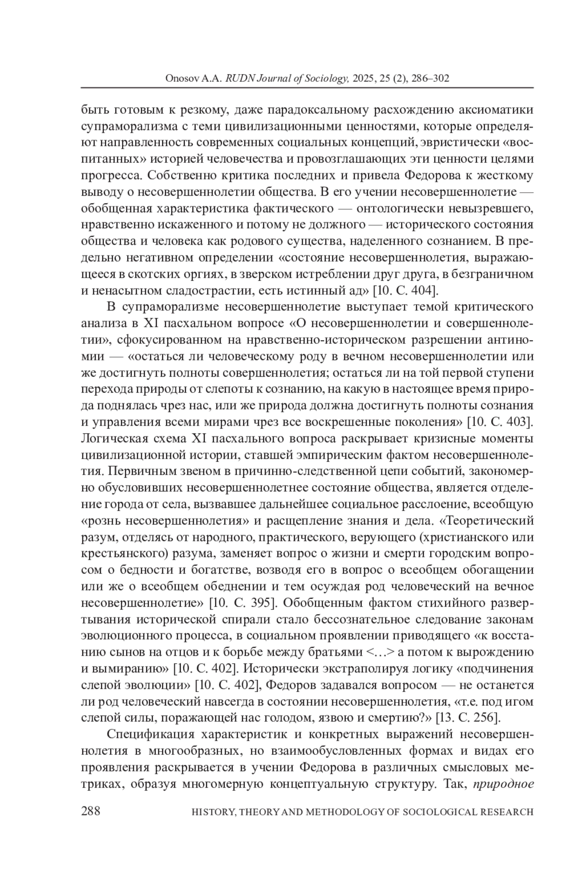 Содержательно все категории супраморализма (1) логически замыкаются на многомерных понятиях исторической зрелости общества, которые, в свою очередь, раскрываются и детализируются в терминосистеме супраморализма. Такая, по- сути, рекурсивно- сетевая структура учения Н. Ф. Федорова обуславливает особый исследовательский интерес и требует определенной аналитической культуры рассмотрения его теоретического канона: тема несовершеннолетия в ее различных аспектах получает содержательную разработку и аналитическое отражение в современных работах, обращенных к социально- философскому наследию Федорова и представителей космизма [см., напр.: 2; 3; 5; 9; 14].