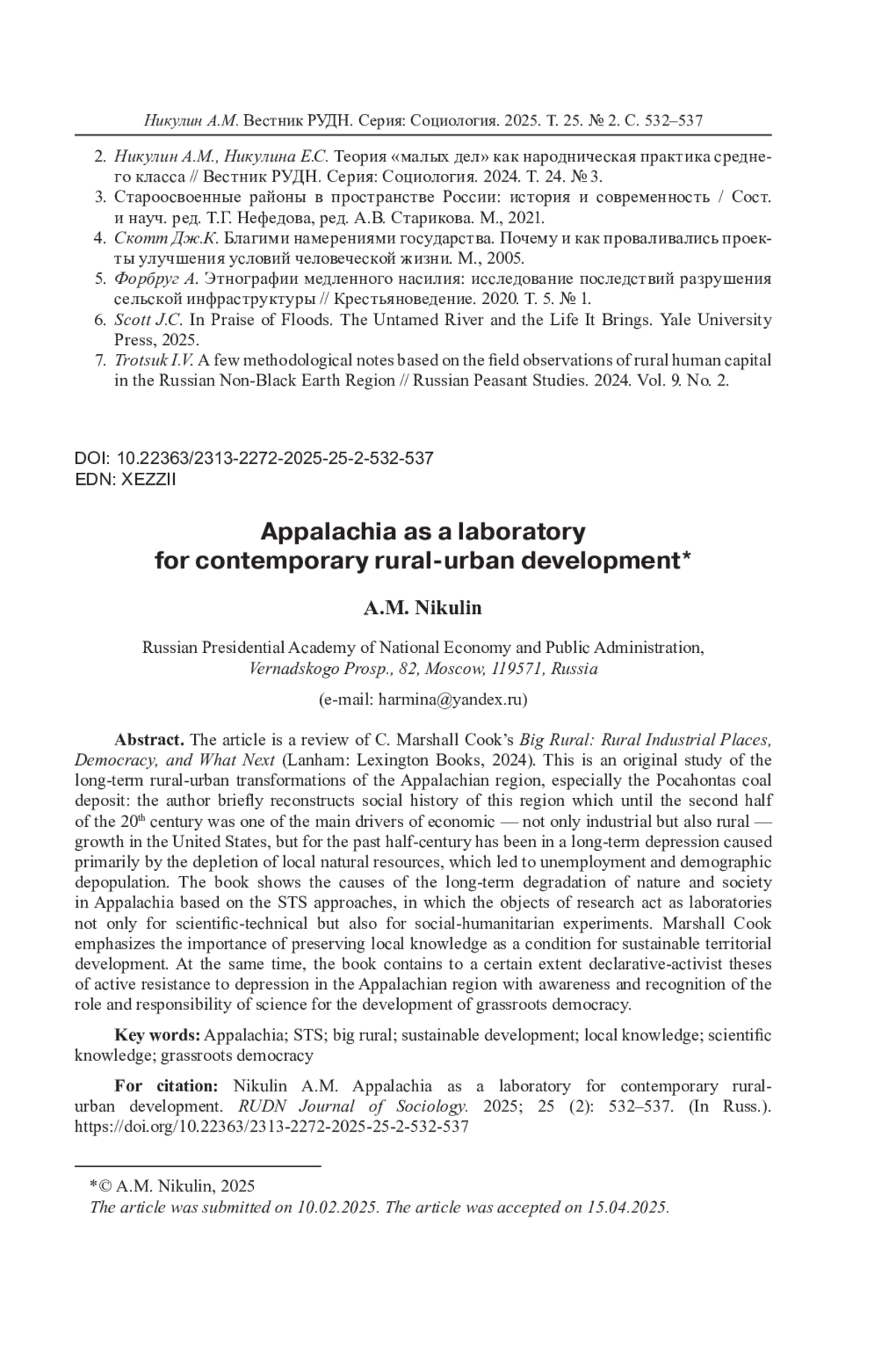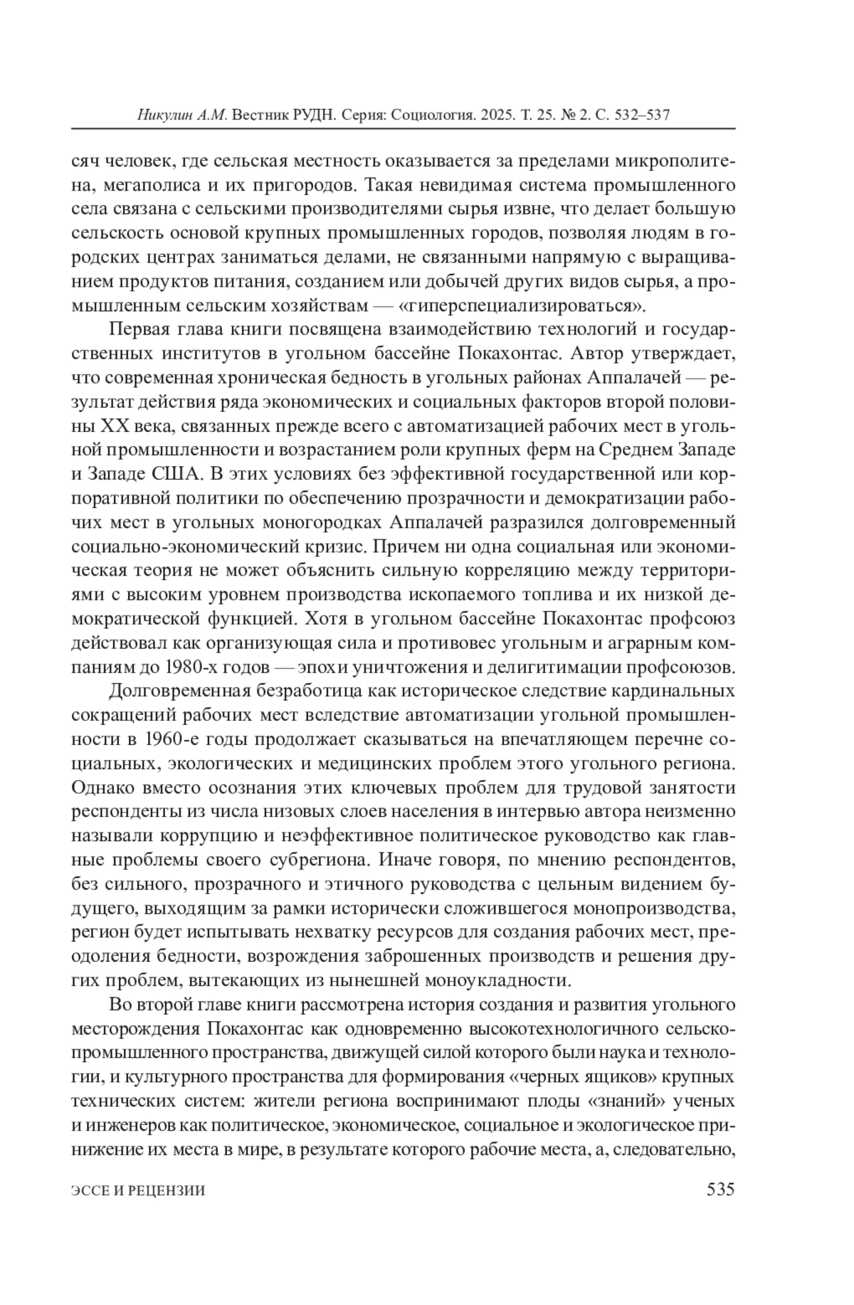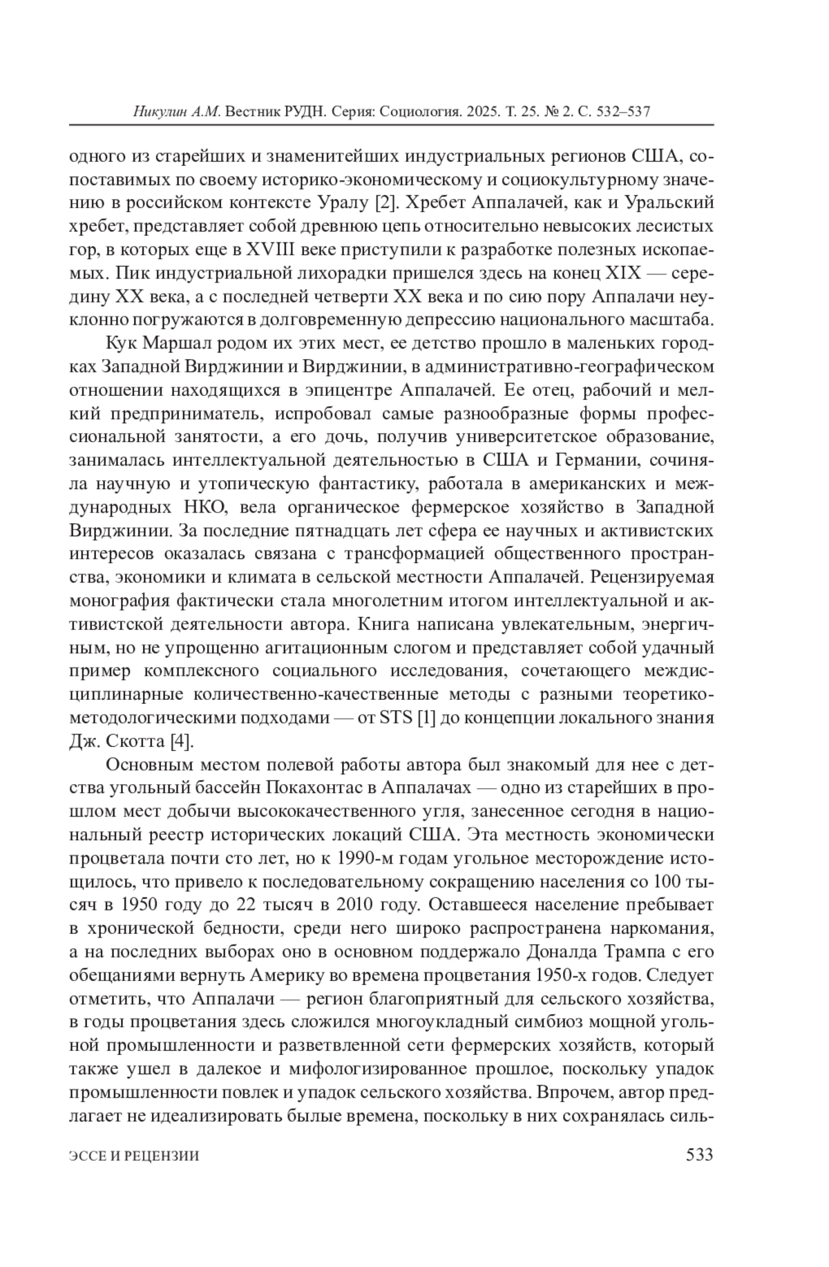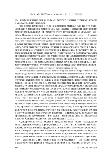 Cтатья представляет собой рецензию на книгу К. Маршал Кук «Большая сельскость: сельско-промышленные районы, демократия и не только» (Ланхэм: Изд-во Лексингтон Букс, 2024. 280 с.). Это оригинальное исследование долговременных сельско-городских трансформаций региона Аппалачей, особенно угольного месторождения Покахонтас: Кук кратко реконструирует социальную историю этого региона, бывшего до второй половины XX века одним из основных драйверов экономического - не только индустриального, но и сельского - роста США, но вот уже как полвека оказавшегося в колее долговременной депрессии, которая обусловлена прежде всего истощением местных природных ресурсов и породила рост безработицы и демографическую депопуляцию. В книге показаны причины долговременной деградации природы и социума Аппалачей на основе подходов STS (социотехнические системы - social-technical systems), в которых объекты исследования выступают как лаборатории не только для научнотехнических, но и социально-гуманитарных экспериментов. Также Кук на протяжении всей книги подчеркивает важность сохранения локального знания как условия устойчивого территориального развития. В то же время книга содержит и в определенной степени декларативно-активистские тезисы деятельностного сопротивления депрессии в регионе Аппалачей посредством осознания и признания роли и ответственности науки за развитие низовой демократии на местах.