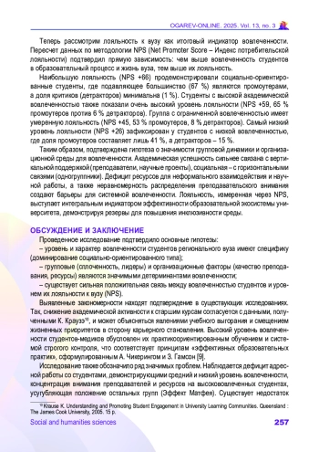 Обсуждение и заключение. Проведенное исследование позволило комплексно оценить уровень, характер и факторы вовлеченности студентов. Полученные результаты создают основу для разработки и реализации целенаправленных мер, ориентированных на повышение качества образовательного процесса и академических результатов студентов.