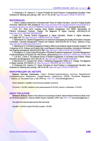 2. Kuh G. D. What we’re Learning about Student Engagement from NSSE: Benchmarks for Effective Educational Practices // Change: The Magazine of Higher Learning. 2003. Vol. 35, issue 2. Pp. 24-32. DOI: 10.1080/00091380309604090