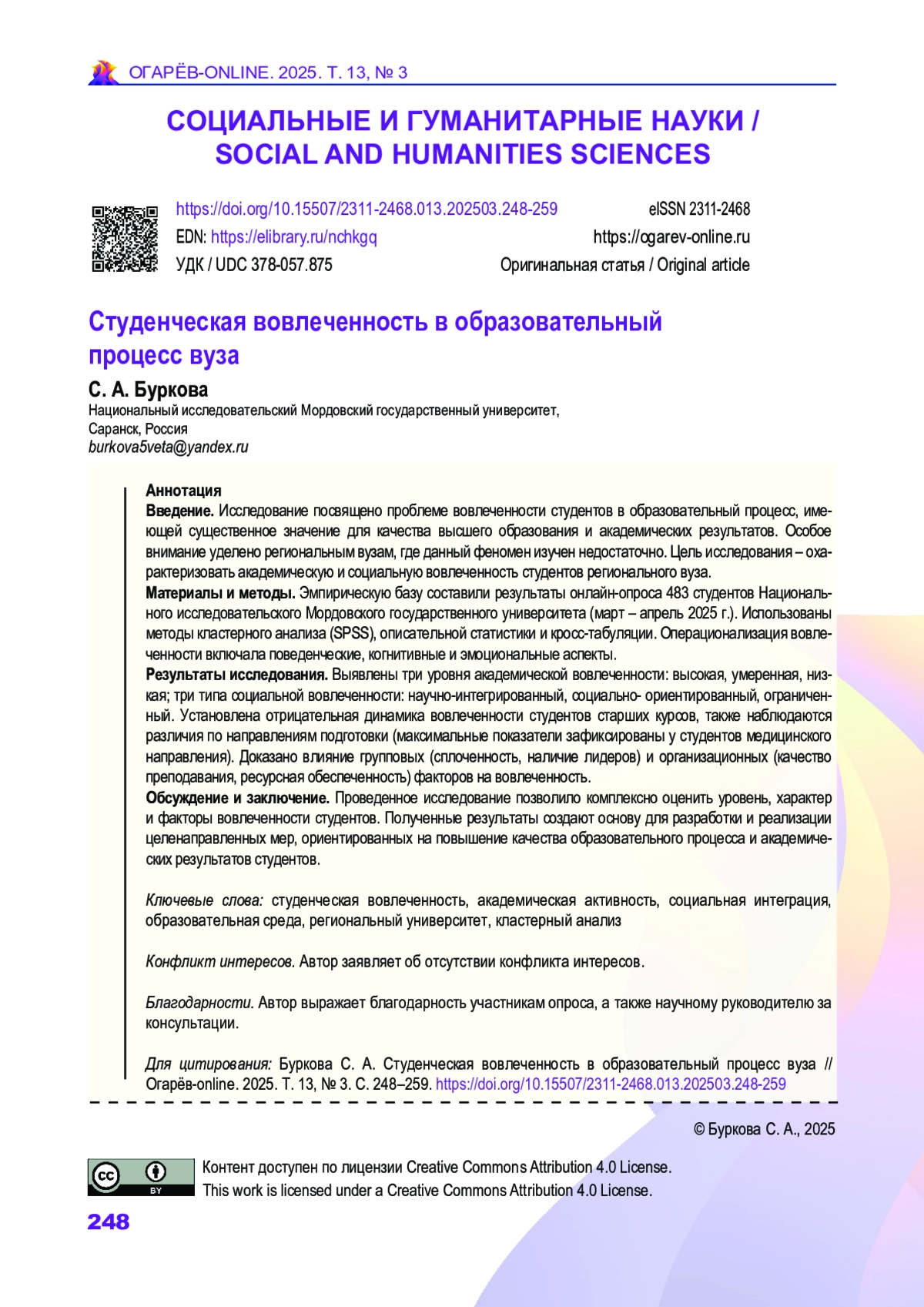 Материалы и методы. Эмпирическую базу составили результаты онлайн-опроса 483 студентов Национального исследовательского Мордовского государственного университета (март – апрель 2025 г.). Использованы методы кластерного анализа (SPSS), описательной статистики и кросс-табуляции. Операционализация вовлеченности включала поведенческие, когнитивные и эмоциональные аспекты.
