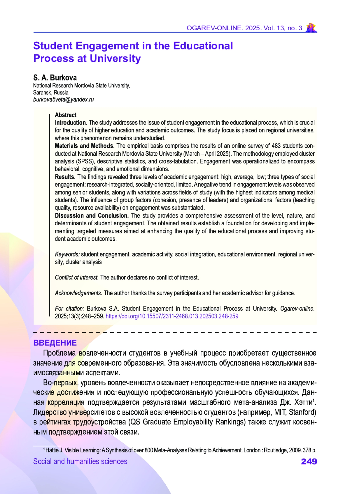 Введение. Исследование посвящено проблеме вовлеченности студентов в образовательный процесс, имеющей существенное значение для качества высшего образования и академических результатов. Особое внимание уделено региональным вузам, где данный феномен изучен недостаточно. Цель исследования – охарактеризовать академическую и социальную вовлеченность студентов регионального вуза.