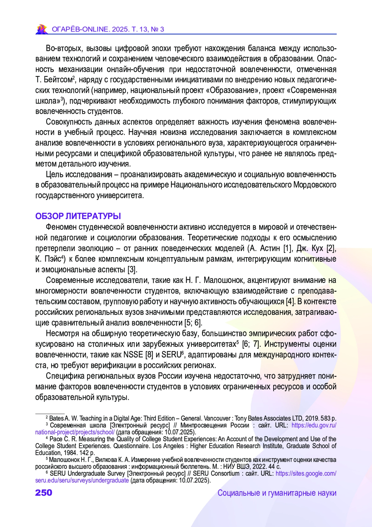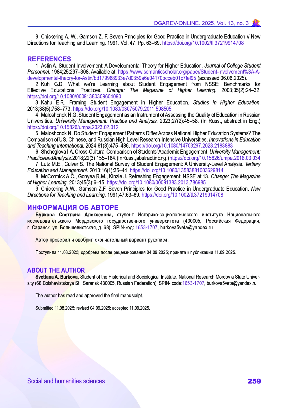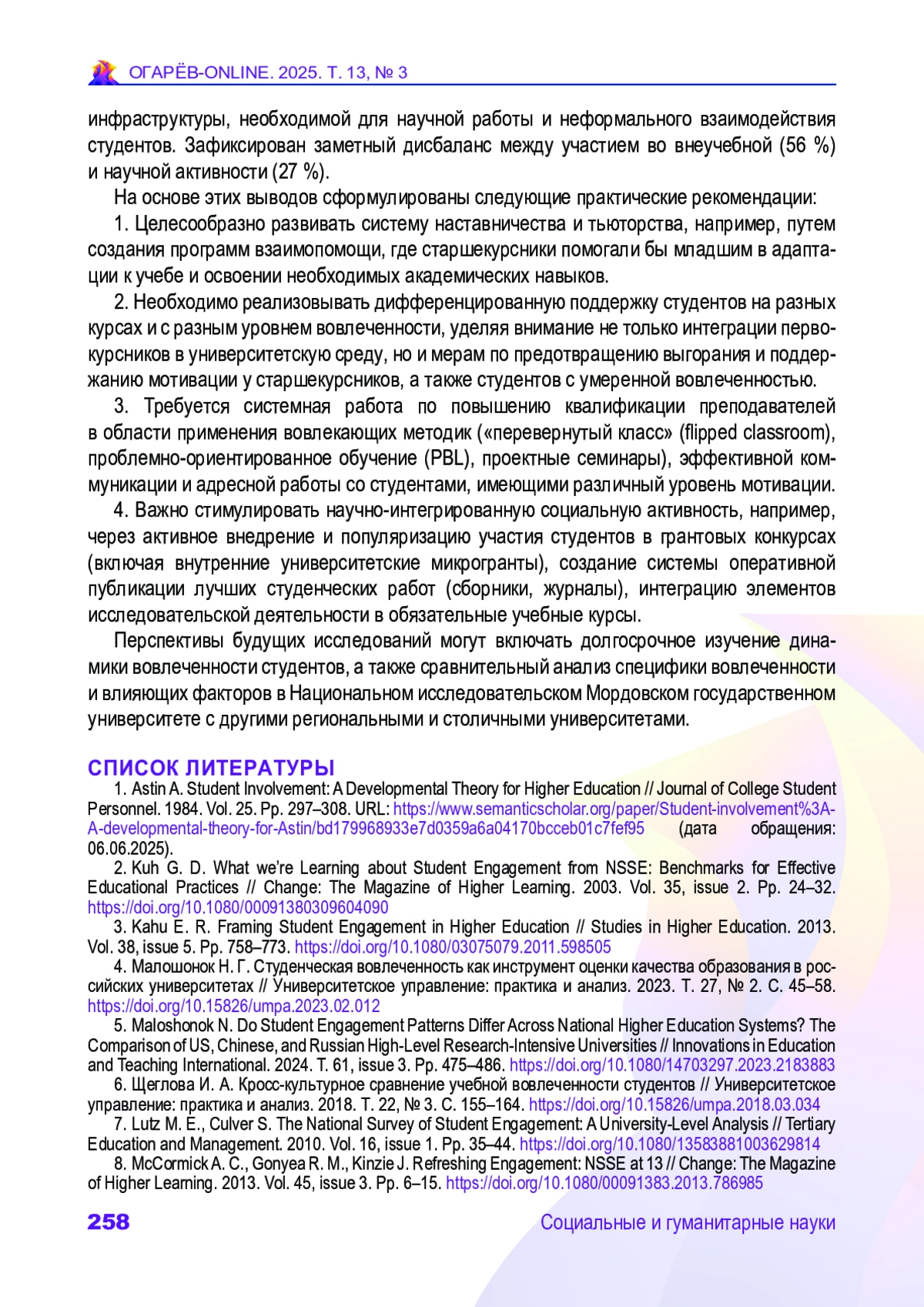 1. Astin A. Student Involvement: A Developmental Theory for Higher Education // Journal of College Student Personnel. 1984. Vol. 25. Pp. 297-308. URL: https://www.semanticscholar.org/paper/Student-involvement%3A-A-developmental-theory-for-Astin/bd179968933e7d0359a6a04170bcceb01c7fef95 (дата обращения: 06.06.2025).