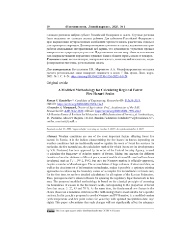 4. Котельников Р.В., Чугаев А.Н. Сравнительная оценка качества индексов пожарной опасности в лесах // Сиб. лесн. журн. 2023. No 6. С. 32-38. EDN: MJAZUV