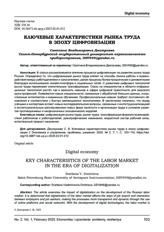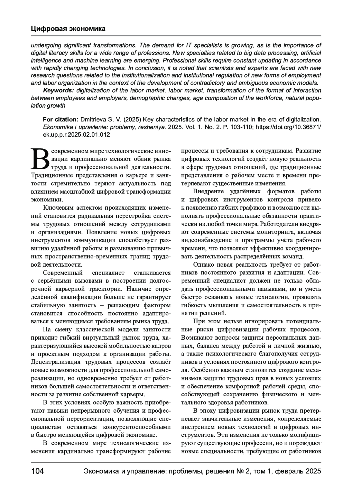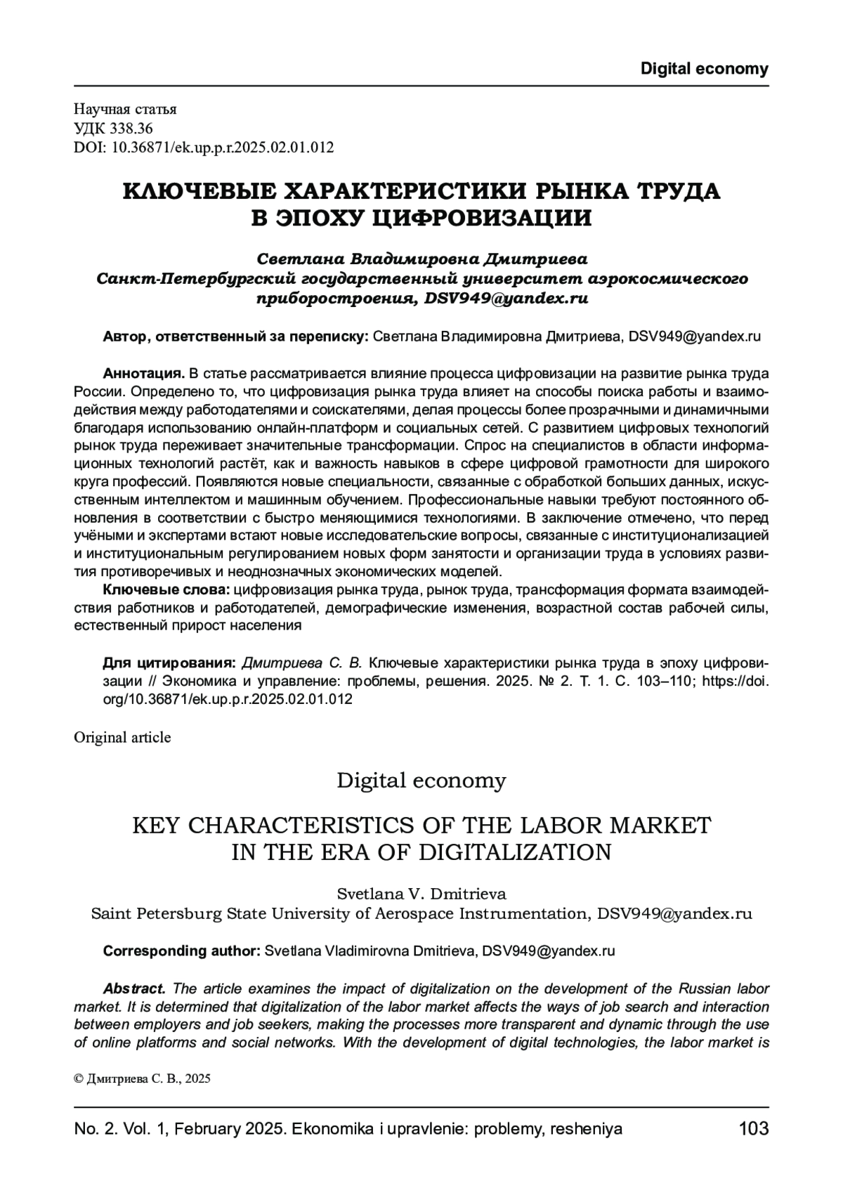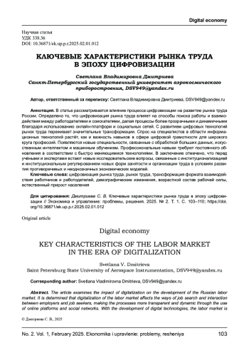 ДМИТРИЕВА С. В. КЛЮЧЕВЫЕ ХАРАКТЕРИСТИКИ РЫНКА ТРУДА В ЭПОХУ ЦИФРОВИЗАЦИИ // ЭКОНОМИКА И УПРАВЛЕНИЕ: ПРОБЛЕМЫ, РЕШЕНИЯ. 2025. ТОМ 1 № 2