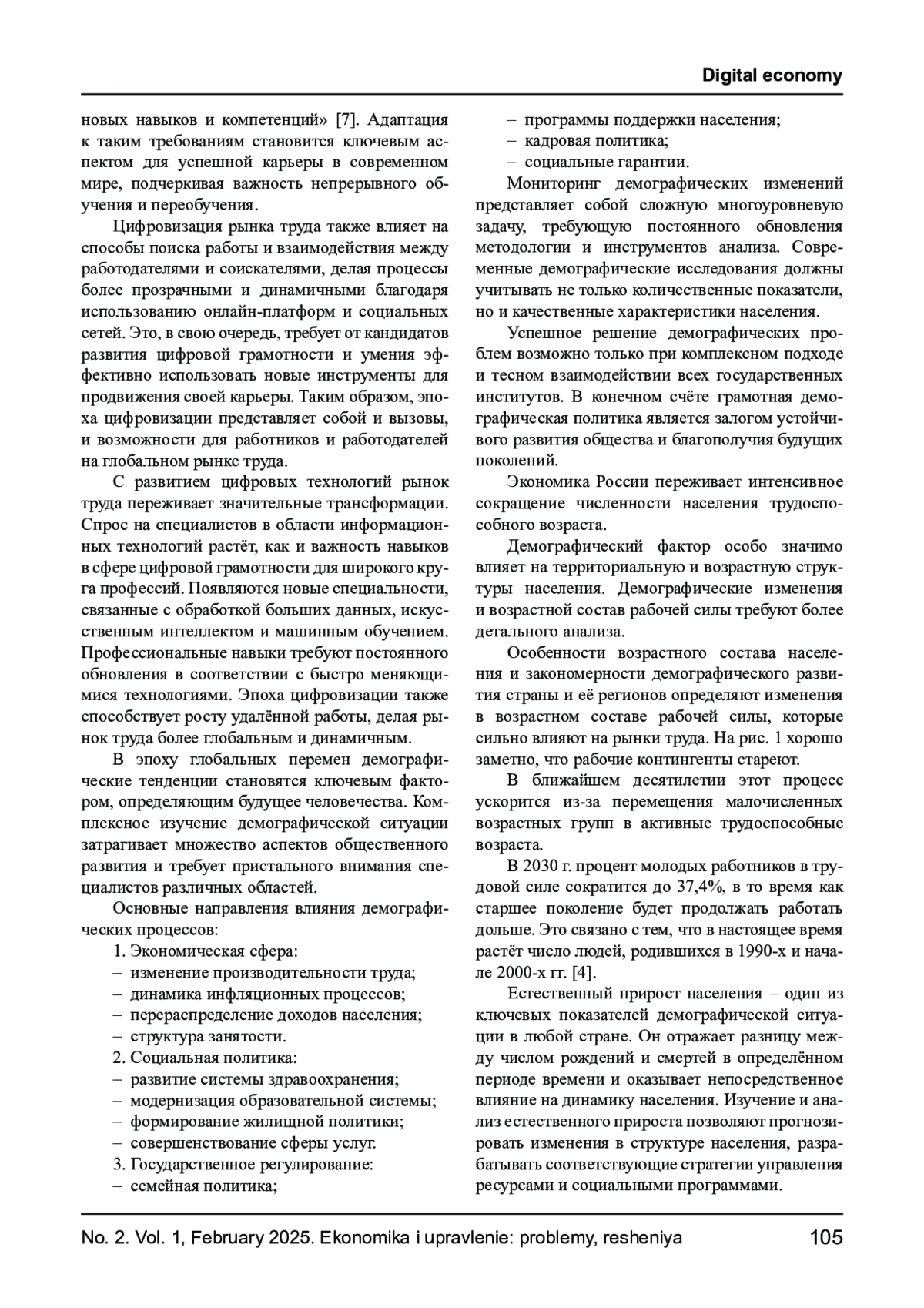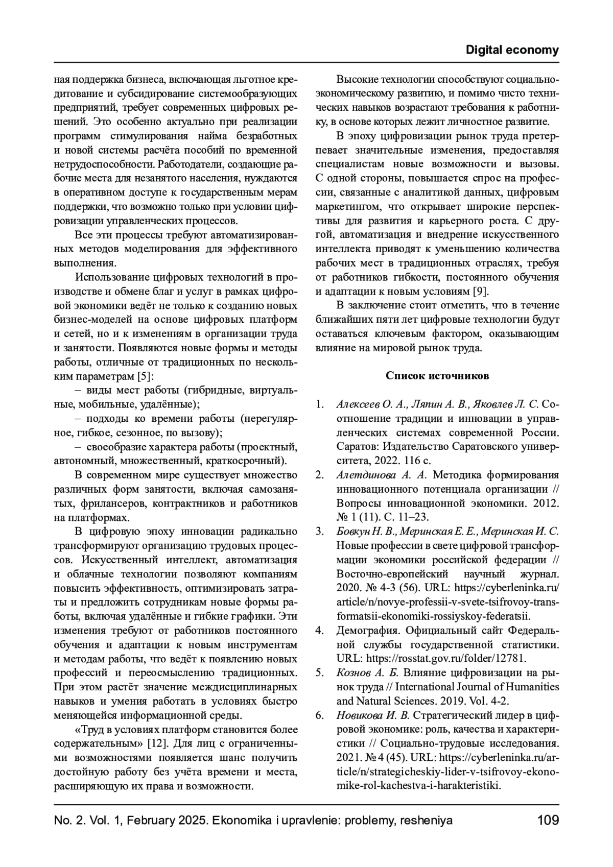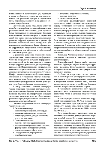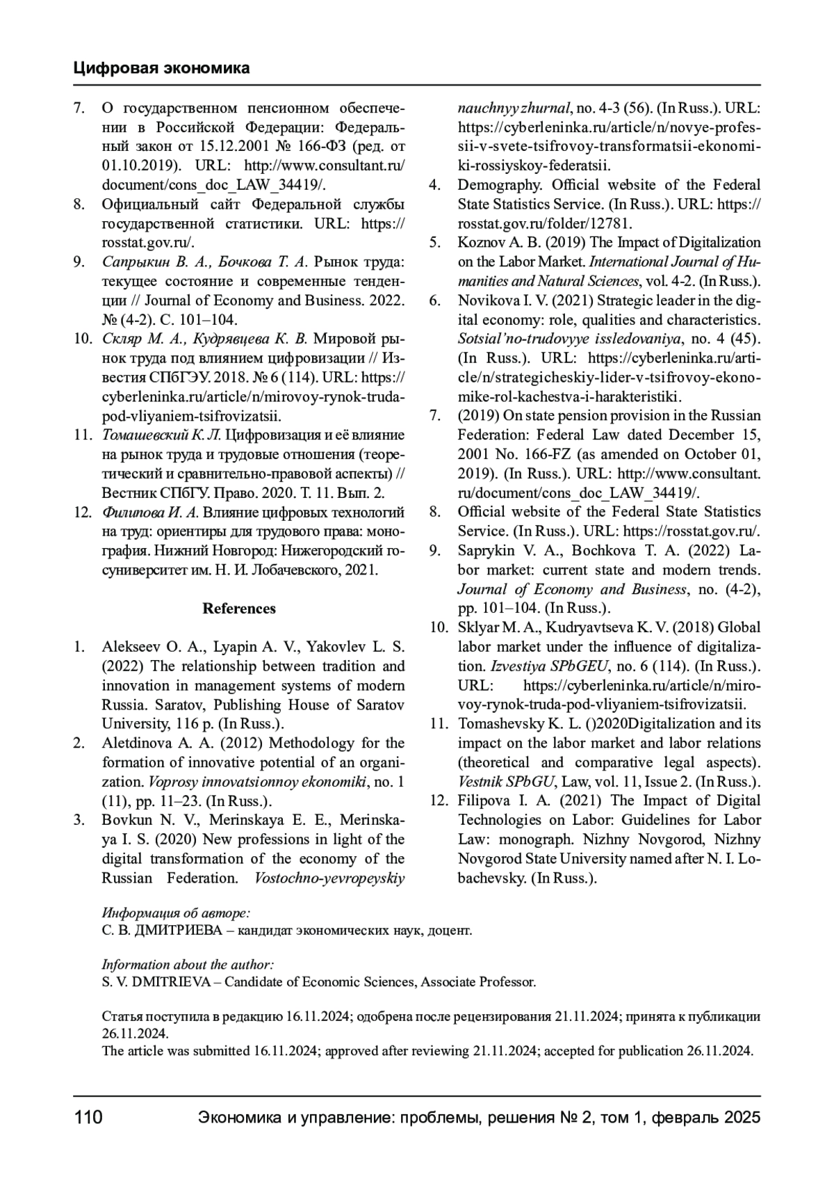 ДМИТРИЕВА С. В. КЛЮЧЕВЫЕ ХАРАКТЕРИСТИКИ РЫНКА ТРУДА В ЭПОХУ ЦИФРОВИЗАЦИИ // ЭКОНОМИКА И УПРАВЛЕНИЕ: ПРОБЛЕМЫ, РЕШЕНИЯ. 2025. ТОМ 1 № 2