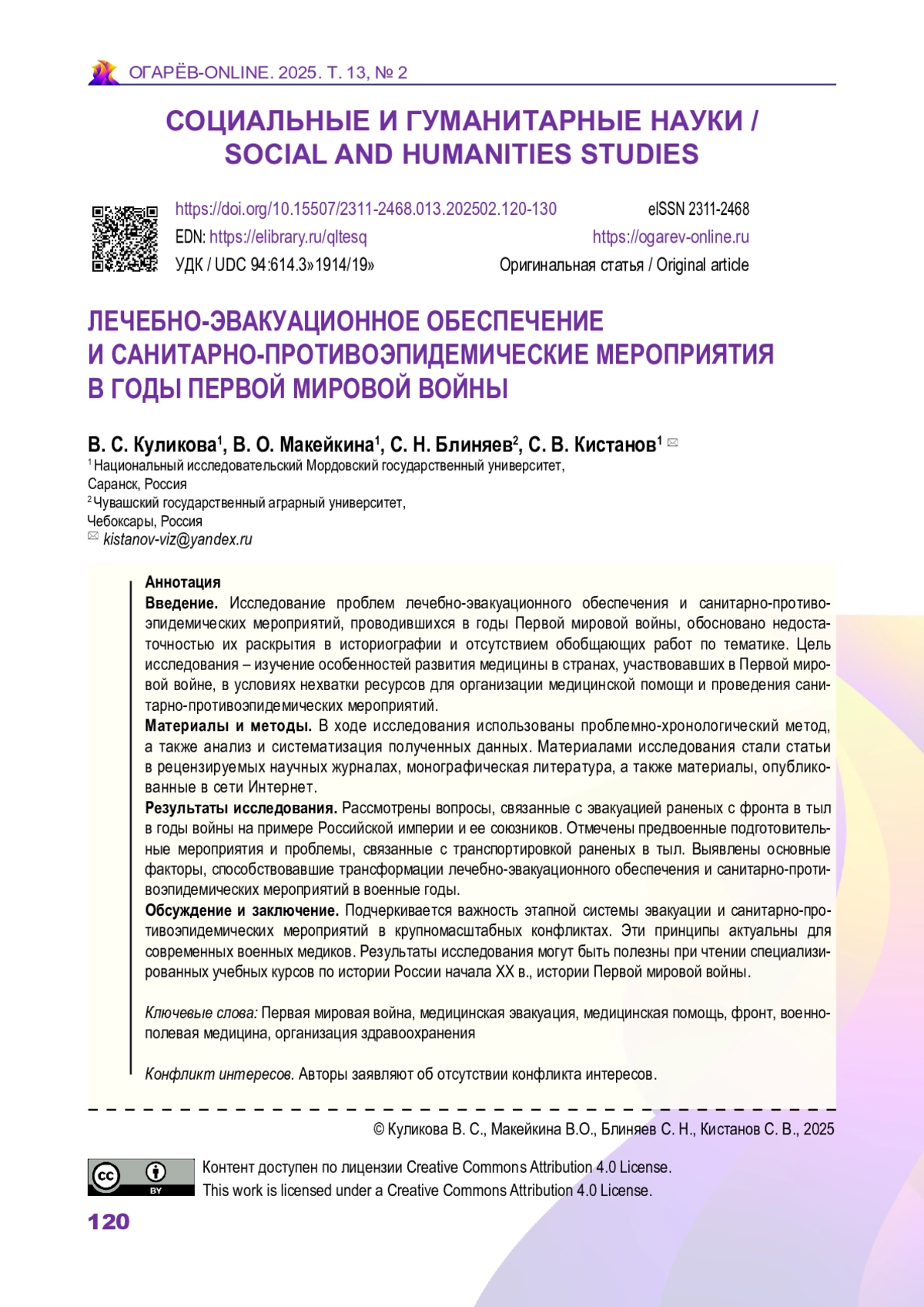 7. Асташов А. Б. Мобилизация и санитария в тылу русской армии в 1914-1918 годах: социально-экологический анализ // Вестник Пермского университета. История. 2021. № 2 (53). С. 27-37. DOI: 10.17072/2219-3111-2021-2-27-37
