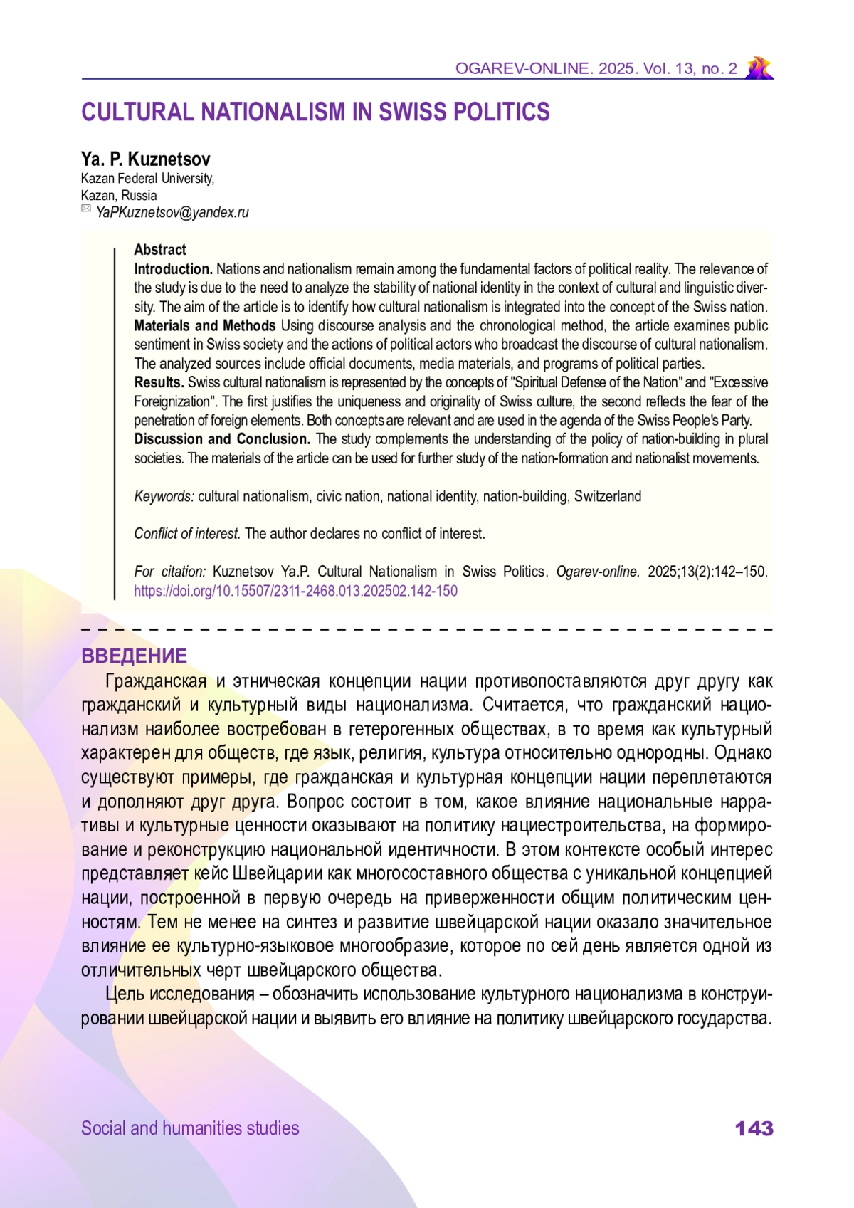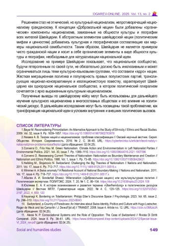 КУЗНЕЦОВ Я. П. КУЛЬТУРНЫЙ НАЦИОНАЛИЗМ В ПОЛИТИКЕ ШВЕЙЦАРИИ // ОГАРЁВ-ONLINE. 2025. № 2 (219), ТОМ 13