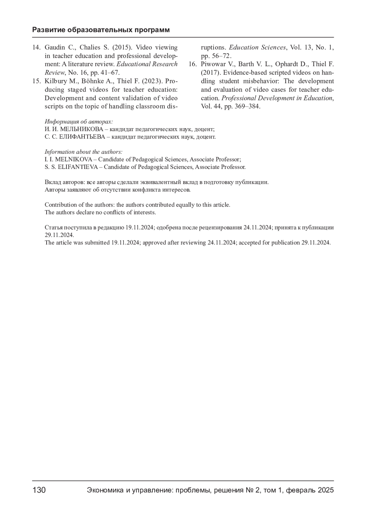 15. Kilbury M., Böhnke A., Thiel F. Producing Staged Videos for Teacher Education: Development and Content Validation of Video Scripts on the Topic of Handling Classroom Disruptions // Education Sciences. - 2023. - Vol. 13, № 1. - P. 56-72. EDN: NNGGCP