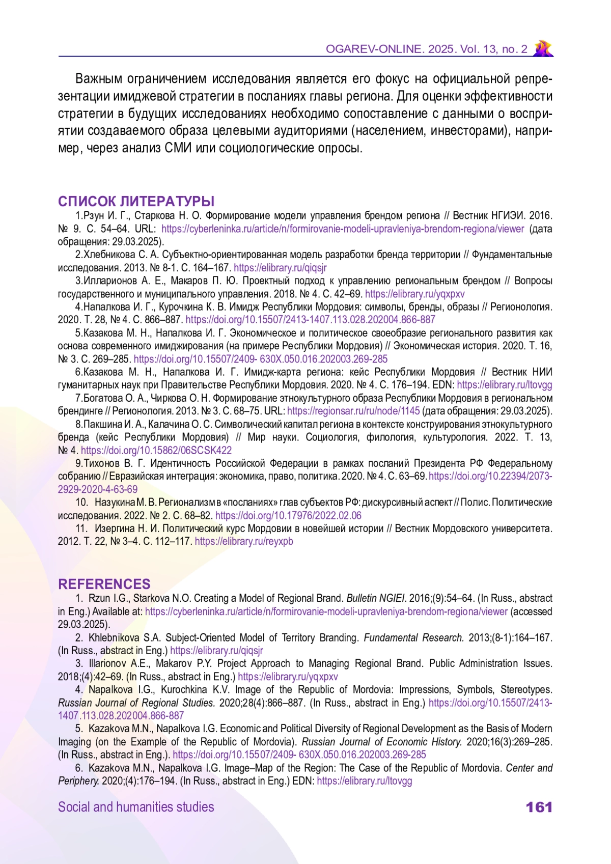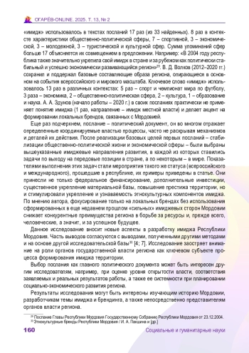 Статья: РЕПРЕЗЕНТАЦИЯ ТЕМ РЕГИОНАЛЬНОГО БРЕНДА И ИМИДЖА В ПОСЛАНИЯХ ГЛАВЫ РЕСПУБЛИКИ МОРДОВИЯ (1996–2024 гг.) (2025)