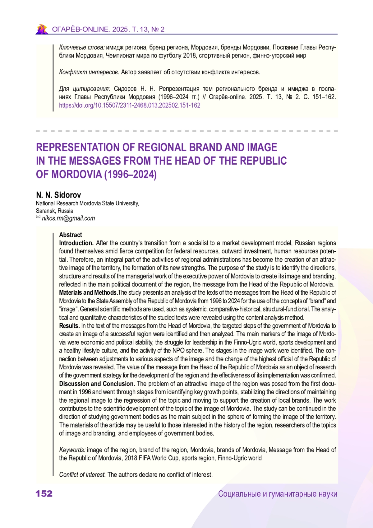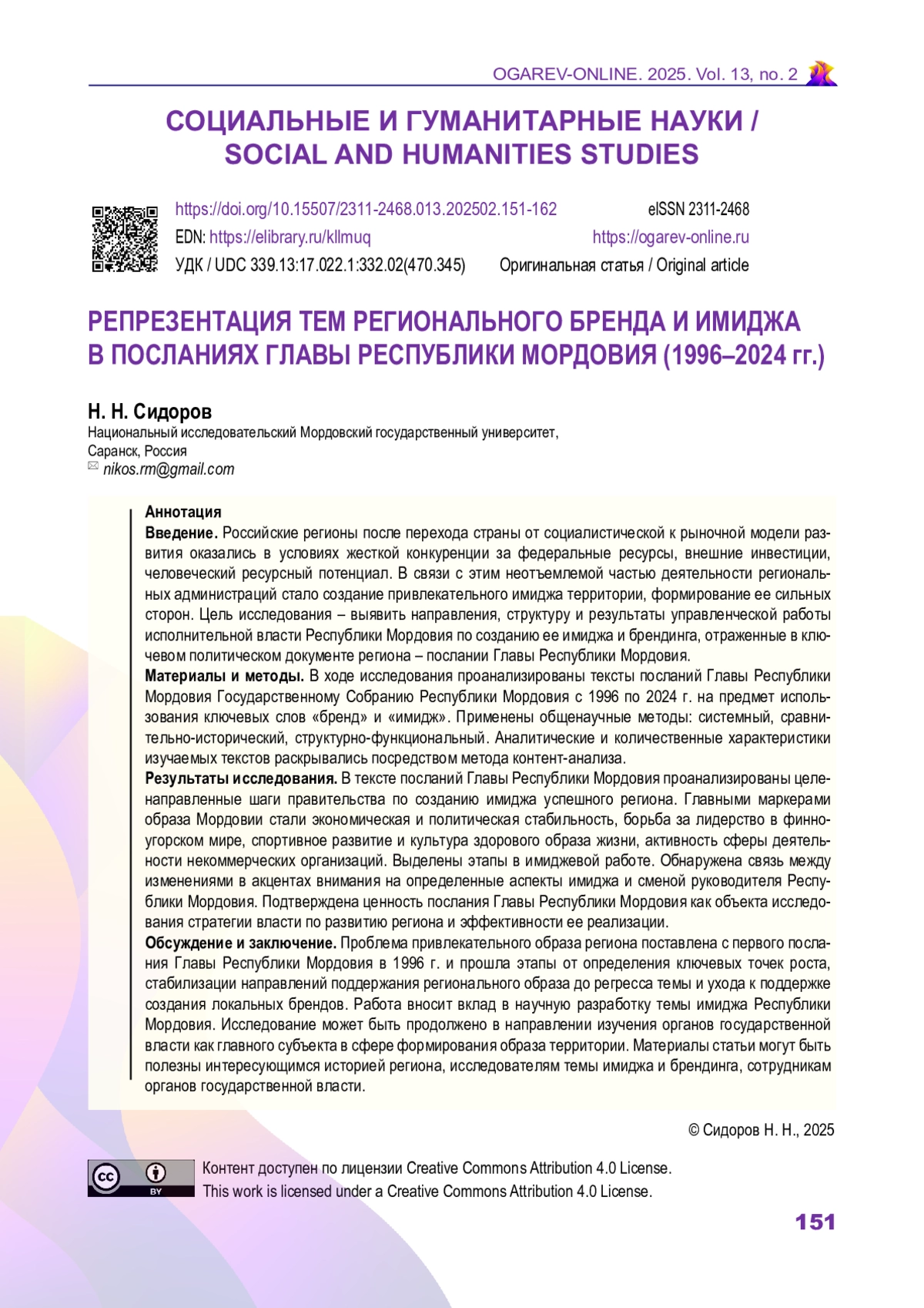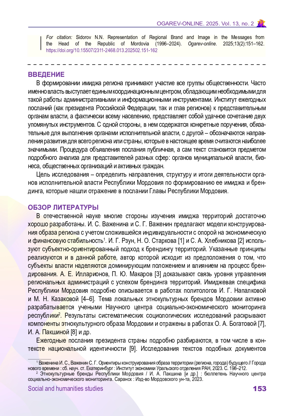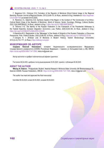 СИДОРОВ Н. Н. РЕПРЕЗЕНТАЦИЯ ТЕМ РЕГИОНАЛЬНОГО БРЕНДА И ИМИДЖА В ПОСЛАНИЯХ ГЛАВЫ РЕСПУБЛИКИ МОРДОВИЯ (1996–2024 ГГ.) // ОГАРЁВ-ONLINE. 2025. № 2 (219), ТОМ 13
