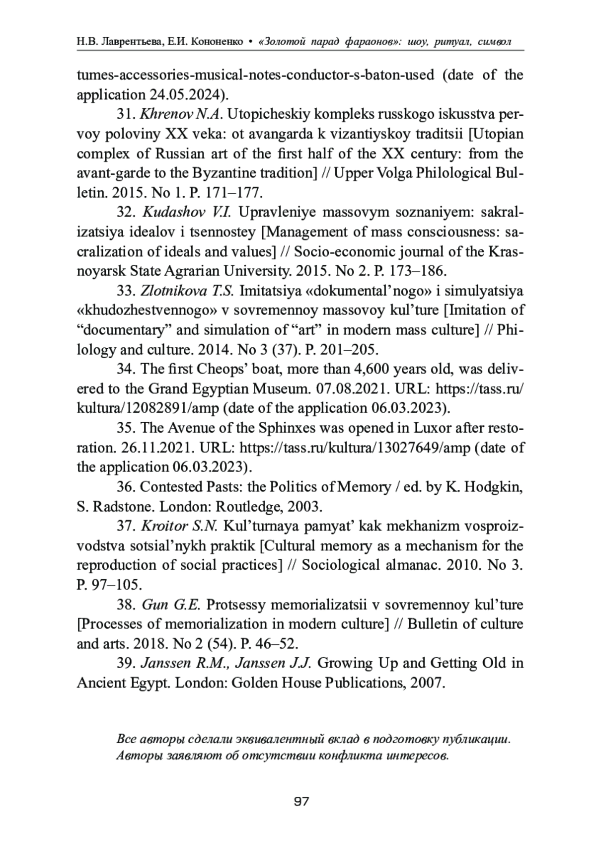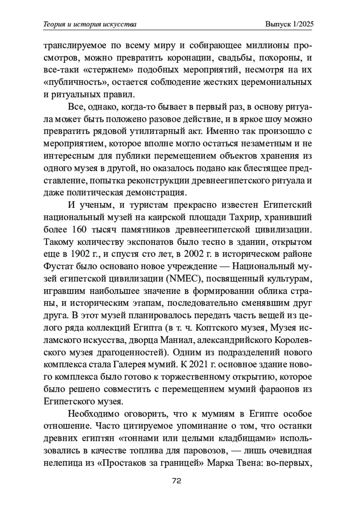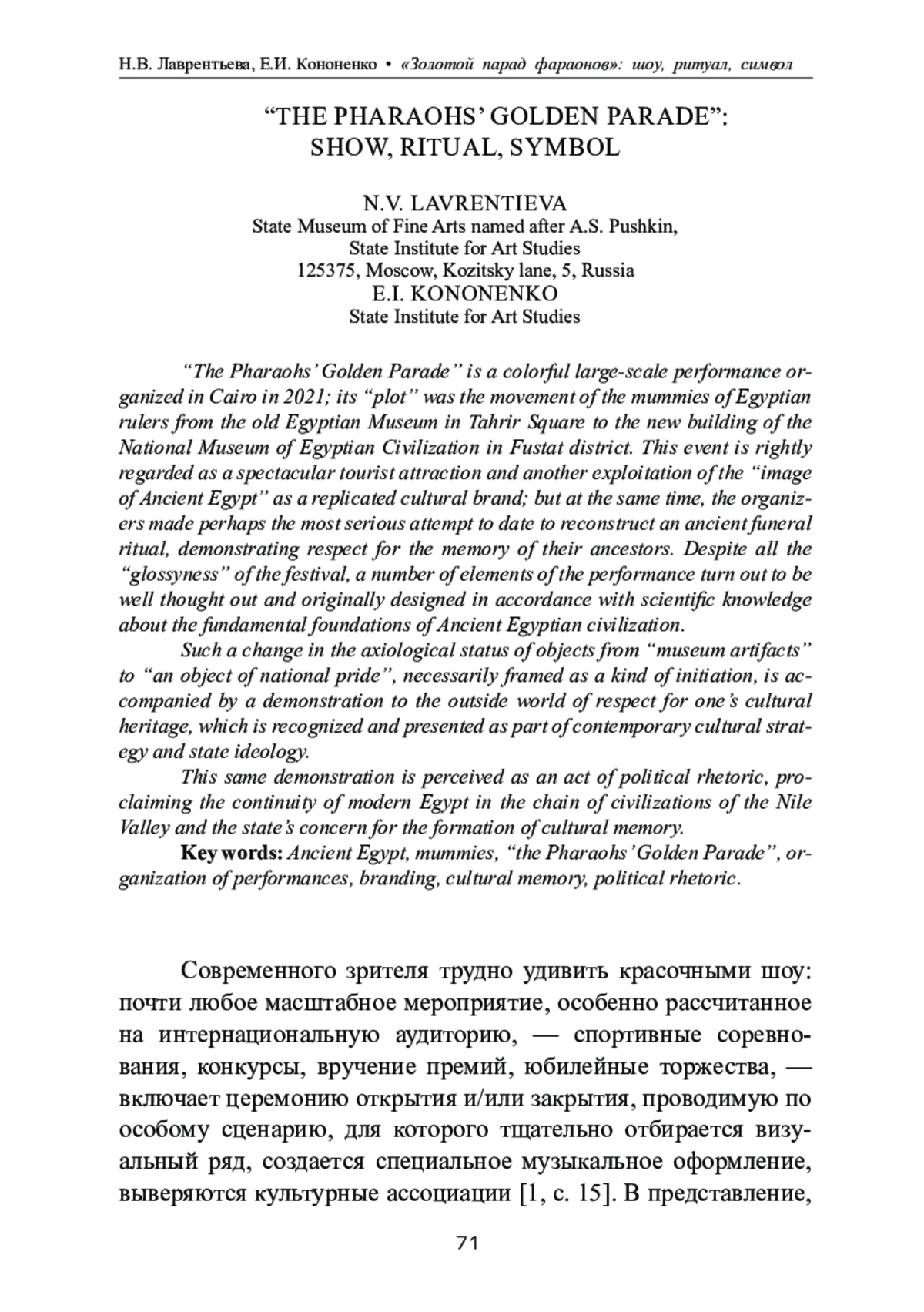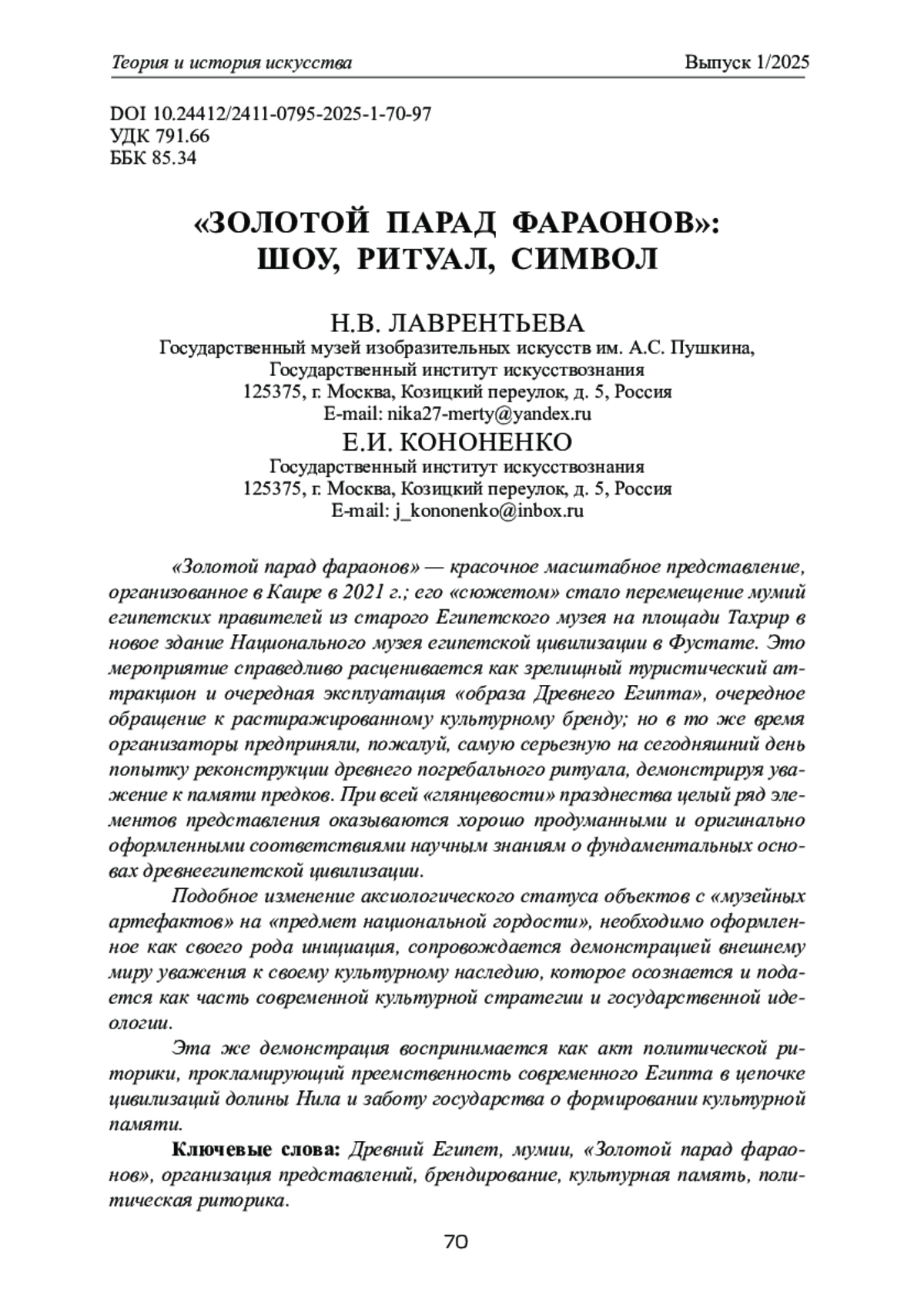 ЛАВРЕНТЬЕВА Н. В., КОНОНЕНКО Е. И. «ЗОЛОТОЙ ПАРАД ФАРАОНОВ»: ШОУ, РИТУАЛ, СИМВОЛ // ТЕОРИЯ И ИСТОРИЯ ИСКУССТВА. 2025. № 1