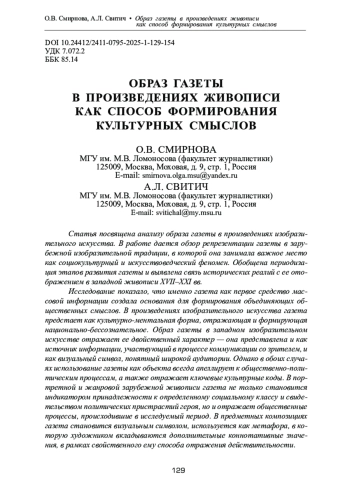 Статья посвящена анализу образа газеты в произведениях изобразительного искусства. В работе дается обзор репрезентации газеты в зарубежной изобразительной традиции, в которой она занимала важное место как социокультурный и искусствоведческий феномен. Обобщена периодизация этапов развития газеты и выявлена связь исторических реалий с ее отображением в западной живописи XVII‒XXI вв. Исследование показало, что именно газета как первое средство массовой информации создала основания для формирования объединяющих общественных смыслов. В произведениях изобразительного искусства газета предстает как культурно-ментальная форма, отражающая и формирующая национально-бессознательное. Образ газеты в западном изобразительном искусстве отражает ее двойственный характер — она представлена и как источник информации, участвующий в процессе коммуникации со зрителем, и как визуальный символ, понятный широкой аудитории. Однако в обоих случаях использование газеты как объекта всегда апеллирует к общественно-политическим процессам, а также отражает ключевые культурные коды. В портретной и жанровой зарубежной живописи газета не только становится индикатором принадлежности к определенному социальному классу и свидетельством политических пристрастий героя, но и отражает общественные процессы, происходившие в исследуемый период. В предметных композициях газета становится визуальным символом, используется как метафора, в которую художником вкладываются дополнительные коннотативные значения, в рамках свойственного ему способа отражения действительности.