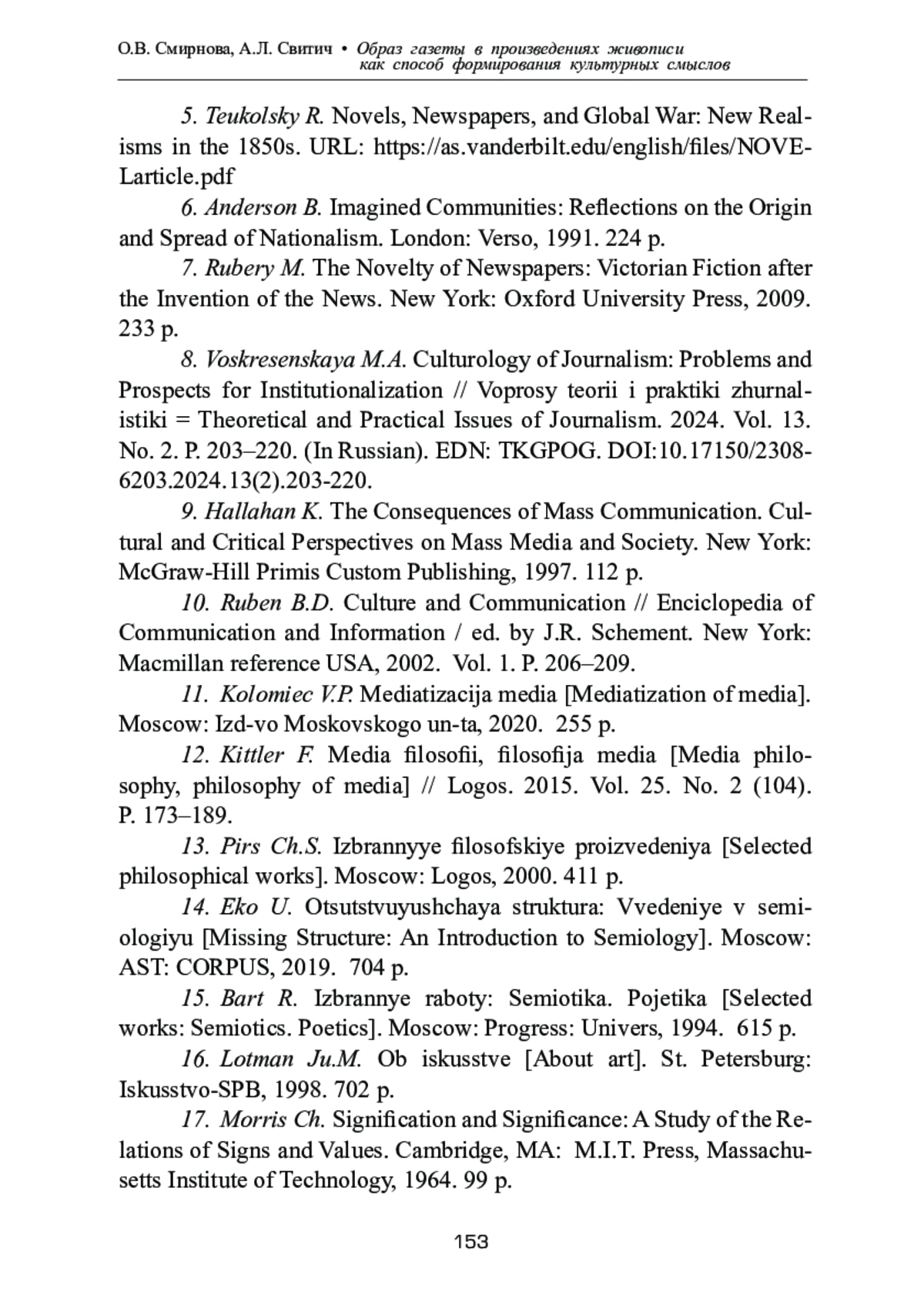 8. Воскресенская М.А. Культурология журналистики: проблемы и перспективы институциализации // Вопросы теории и практики журналистики. 2024. Т. 13. № 2. С. 203-220. 10.17150/2308- 6203.2024.13(2).203-220. DOI: 10.17150/2308-6203.2024.13(2).203-220 EDN: TKGPOG