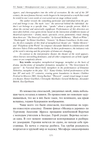 В литературе метафора возникает на основе употребления «слова или выражения в переносном значении, в основе которого лежит сравнение предмета или явления с каким-либо другим на основании их общего признака» [9]. Театральная метафора — это мультимодальный образ, возникающий на пересечении языков разных видов искусства. Это — концентрат смысла, глубинная суть, обобщение, скрытое за конкретной историей. Метафора не нуждается в пояснениях. Свободное сопоставление (взаимодействие) несопоставимого провоцирует зрителя достраивать связи. В истории сохранились знаменитые финалы из «Ревизора» Всеволода Мейерхольда, «Месяца в деревне» Анатолия Эфроса, «Макбета» Эймунтаса Някрошюса. Их принято называть сценическими метафорами. Режиссерский театр, который появился на рубеже ХIХ‒ХХ вв. и развивался как искусство интерпретации, стремился превратить театр в храм Искусства, втягивая в орбиту сотворчества сценографов, художников по костюмам, композиторов, художников по свету, балетмейстеров. К концу ХХ в. наиболее известные литературные произведения стали трактоваться как миф, который можно пересказать своими словами или даже разыграть на сцене без слов. Автор из общего выделяет частное, индивидуальное. Миф за индивидуальным «видит» всеобщее. Авторское искусство принадлежит конкретному времени, повествует о человеке своей эпохи. Миф — о вечном и общезначимом. В последние десятилетия многие спектакли этого направления часто представляют собой гибридные, межжанровые формы, где на равных взаимодействуют разные средства театральной выразительности — драмы, музыки, зрелища, цирка, пантомимы, ритуала. Событиями рубежа ХХ–ХХI столетий стали постановки «Улица крокодилов» Саймона Макберни, «Черным по белому», «Хаширигаки» Хайнера Геббельса, «Генезис» Ромео Кастеллуччи. На отечественной сцене первые образцы такого рода метафорического театра — «Сидур-мистерия» и «Полифония мира» композитора Александра Бакши в соавторстве с режиссерами Валерием Фокиным и Камой Гинкасом. В этих спектаклях отсутствует инициирующая роль слова и меняются принципы драматургии. В противовес интерпретационному театру в это же время появляется театр слова, где главенствует литературное повествование, а все остальные компоненты малозначимы или вообще отсутствуют. Данная статья посвящена развитию метафорического театра, где рождаются новое художественное мышление, язык, драматургия и принципиально новые модели сценического искусства.