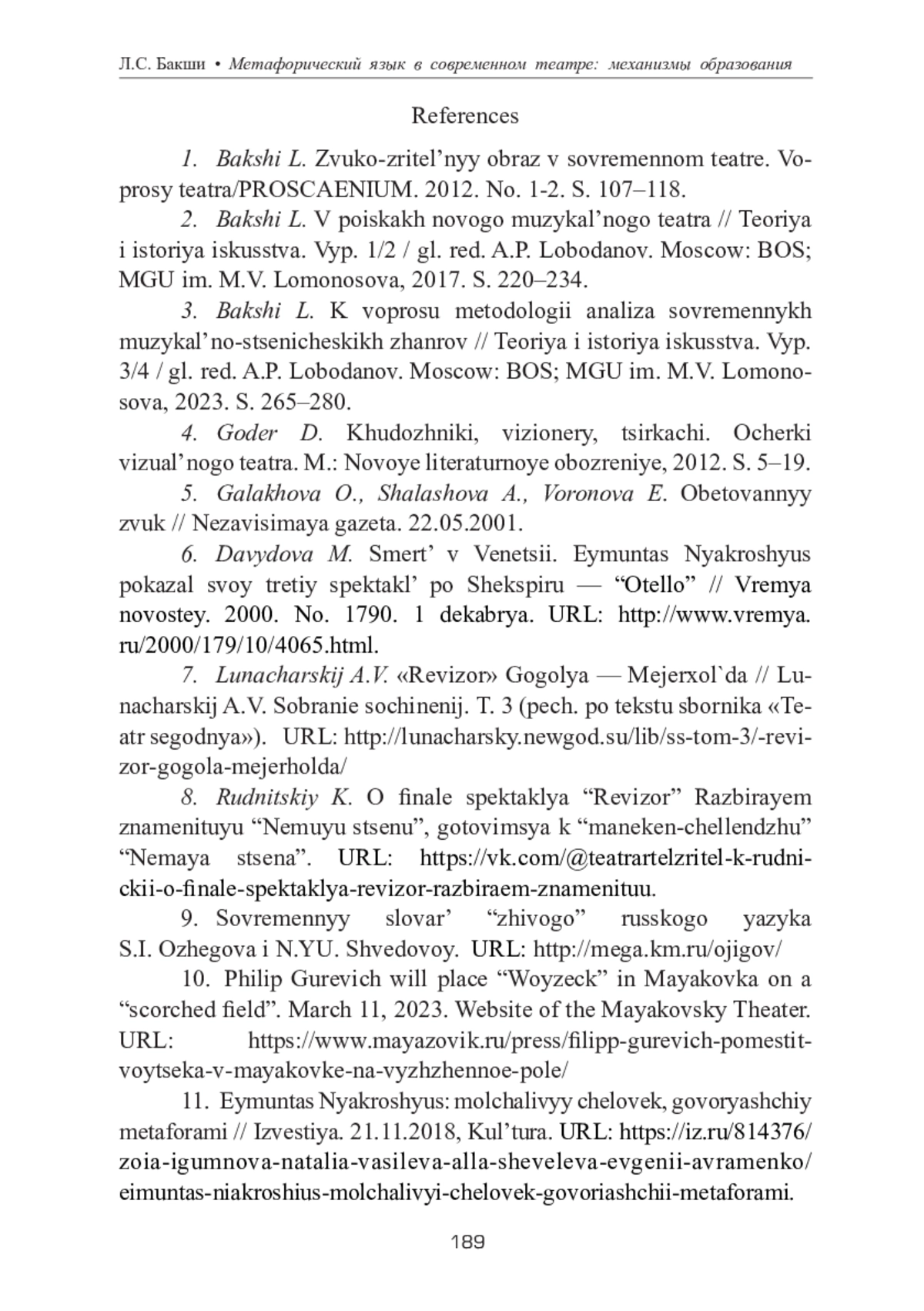 1. Бакши Л. Звуко-зрительный образ в современном театре // Вопросы театра/PROSCAENIUM. 2012. № 1-2. С. 107-118.