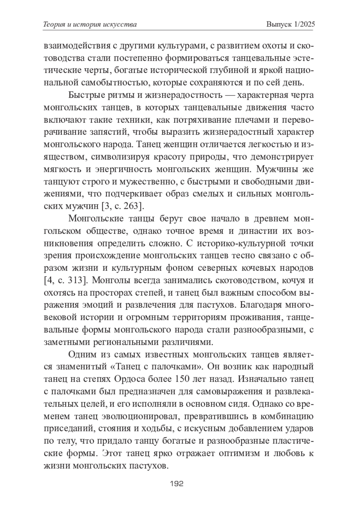 Монгольские танцы, являясь важным нематериальным культурным наследием Китая, демонстрируют уникальную культурную идентичность и гуманитарные художественные ценности монгольского народа. В данной статье рассматривается, как в процессе создания монгольских танцев происходит искусное слияние традиционных и современных элементов, а также влияние этого слияния на культурную идентичность и художественные инновации. Культурная идентичность и художественные инновации в создании монгольских танцев взаимозависимы и взаимно поддерживают друг друга. Благодаря искусному сочетанию традиционных и современных элементов, монгольские танцы сохраняют свою уникальность и одновременно демонстрируют очарование и дух времени. Такой подход к творчеству предоставляет реальный путь для сохранения и развития монгольской культуры, а также служит примером для создания танцев других народов в контексте межкультурного обмена. Монгольское танцевальное искусство, являясь неотъемлемой частью культурного строительства Китая, должно быть тесно связано с ожиданиями партии и государства в отношении культурной деятельности. В процессе создания монгольских танцев следует в полной мере отражать культурную идентичность в формах, содержании, темах и духе. В статье отмечается необходимость учитывать концепции развития современного общества и использовать передовые технологии искусственного интеллекта для всесторонних инноваций, что будет способствовать процветанию монгольских танцев и эффективному сохранению и защите традиционной танцевальной культуры.