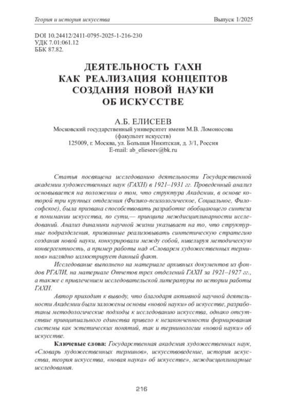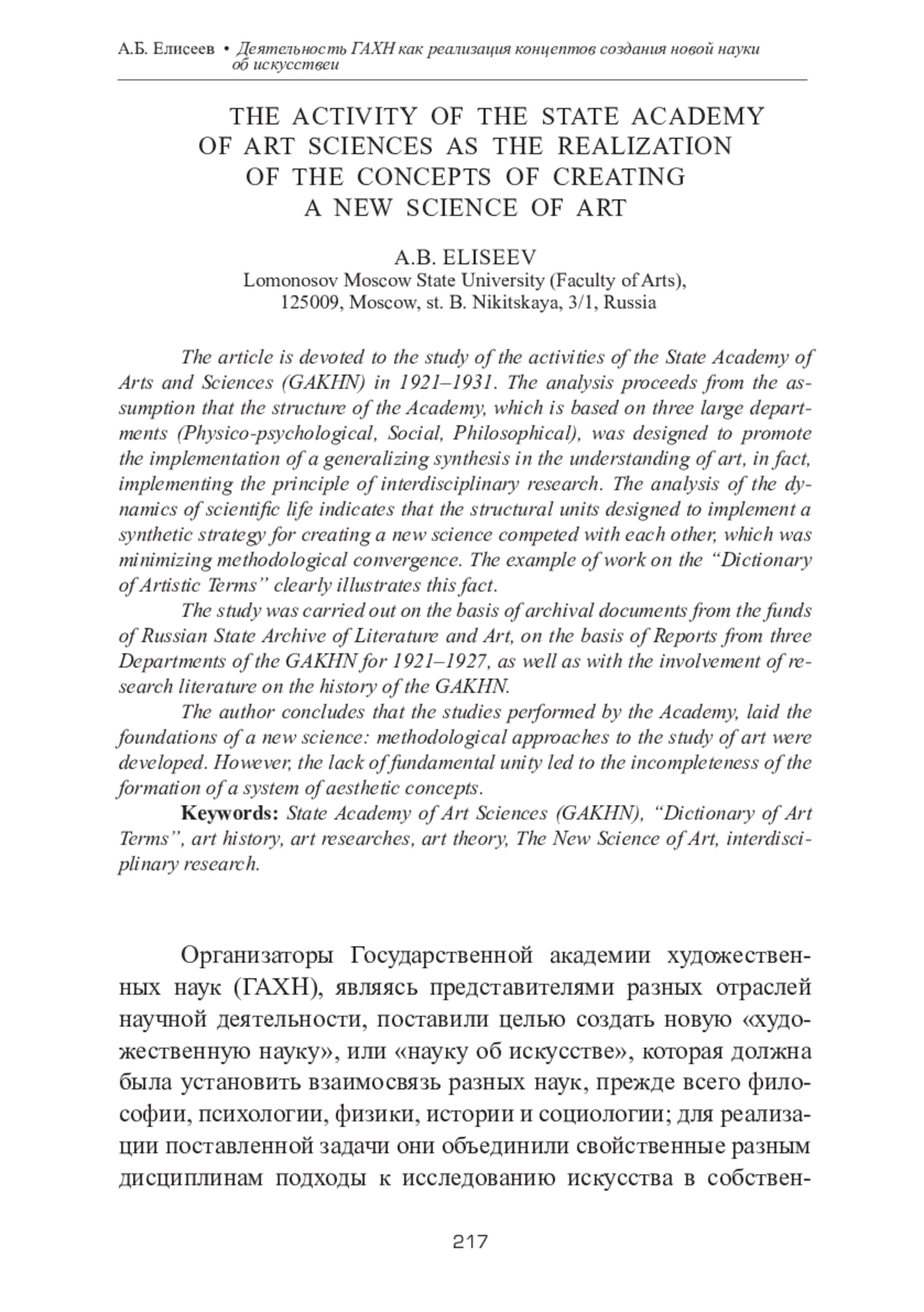 Статья посвящена исследованию деятельности Государственной академии художественных наук (ГАХН) в 1921‒1931 гг. Проведенный анализ основывается на положении о том, что структура Академии, в основе которой три крупных отделения (Физико-психологическое, Социальное, Философское), была призвана способствовать разработке обобщающего синтеза в понимании искусства, по сути,— принципа междисциплинарности исследований. Анализ динамики научной жизни указывает на то, что структурные подразделения, призванные реализовывать синтетическую стратегию создания новой науки, конкурировали между собой, нивелируя методическую конвергентность, а пример работы над «Словарем художественных терминов» наглядно иллюстрирует данный факт. Исследование выполнено на материале архивных документов из фондов РГАЛИ, на материале Отчетов трех отделений ГАХН за 1921‒1927 гг., а также с привлечением исследовательской литературы по истории работы ГАХН. Автор приходит к выводу, что благодаря активной научной деятельности Академии были заложены основы «новой науки» об искусстве, разработаны методологические подходы к исследованию искусства, однако отсутствие принципиального единства привело к незаконченности формирования системы как эстетических понятий, так и терминологии «новой науки» об искусстве