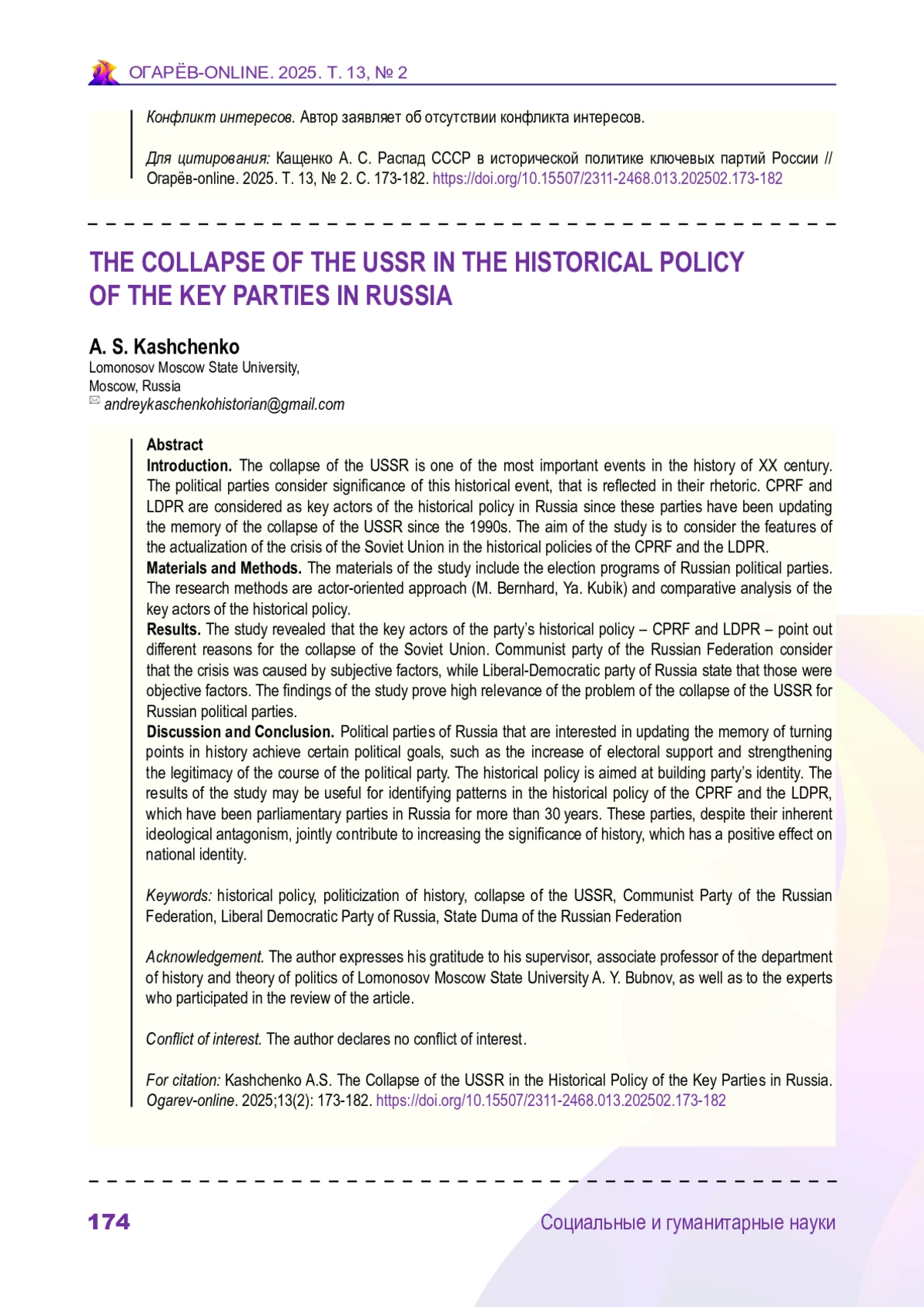 Результаты исследования. Выявлено, что ключевые акторы партийной исторической политики – КПРФ и ЛДПР – видят разные причины, вызвавшие распад Советского Союза. КПРФ полагает, что кризис государственности вызван субъективными, а ЛДПР – объективными факторами. Доказана высокая актуальность проблемы распада СССР для российских политических партий.