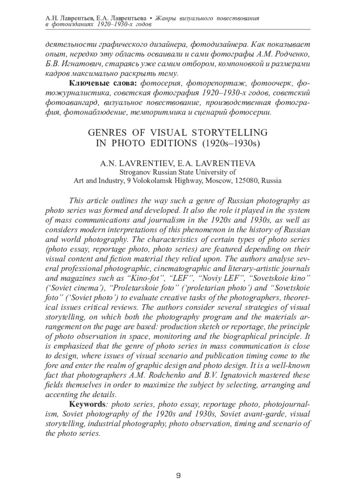 Статья посвящена истории становления и развития жанра фотосерии в отечественном фотоискусстве, его месту в системе массовых коммуникаций и журналистики 1920-х и 1930-х годов. Рассматриваются современные трактовки этого феномена в истории отечественной и мировой фотографии. Формулируется характеристика отдельных видов фотосерий в зависимости от характера визуального и литературного материала, который иллюстрирует тот или иной фотографический ряд: фотоочерк, фоторепортаж, фотосерия. Авторы анализируют творческие художественные задачи фотомастеров, теоретические посылки и критические отклики, отраженные в профессиональной фотографической, кинематографической и литературно-художественной печати в таких периодических изданиях, как «Кино-фот», «ЛЕФ» и «Новый ЛЕФ», «Советское кино», «Пролетарское фото», «Советское фото». Выделяются несколько стратегий визуального повествования, на которых строится как программа фотосъемки, так и порядок размещения материалов на страницах изданий: производственный очерк или репортаж, обсмотр со всех точек в пространстве, принцип фотонаблюдения, биографический принцип. Подчеркивается, что формы бытования фотосерии в системе массовой коммуникации выводят этот жанр в пограничную область с дизайном, где вопросы визуального сценария, темпоритмики издания выходят на первый план и относятся уже к сфере деятельности графического дизайнера, фотодизайнера. Как показывает опыт, нередко эту область осваивали и сами фотографы А. М. Родченко, Б. В. Игнатович, стараясь уже самим отбором, компоновкой и размерами кадров максимально раскрыть тему.