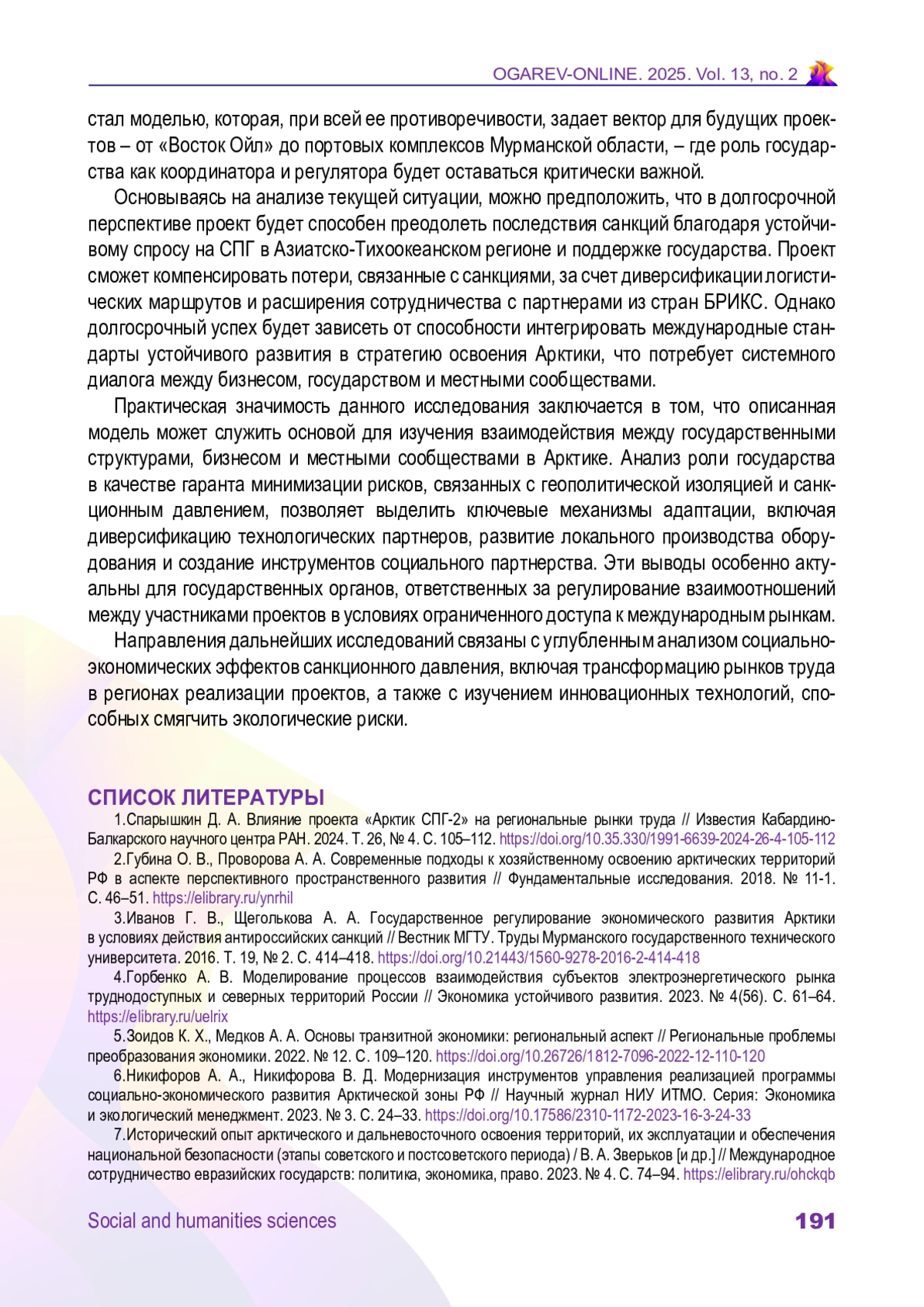 1. Спарышкин Д. А. Влияние проекта “Арктик СПГ-2” на региональные рынки труда // Известия Кабардино-Балкарского научного центра РАН. 2024. Т. 26, № 4. С. 105-112. https://doi.org/10.35.330/1991-6639-2024-26-4-105-112.