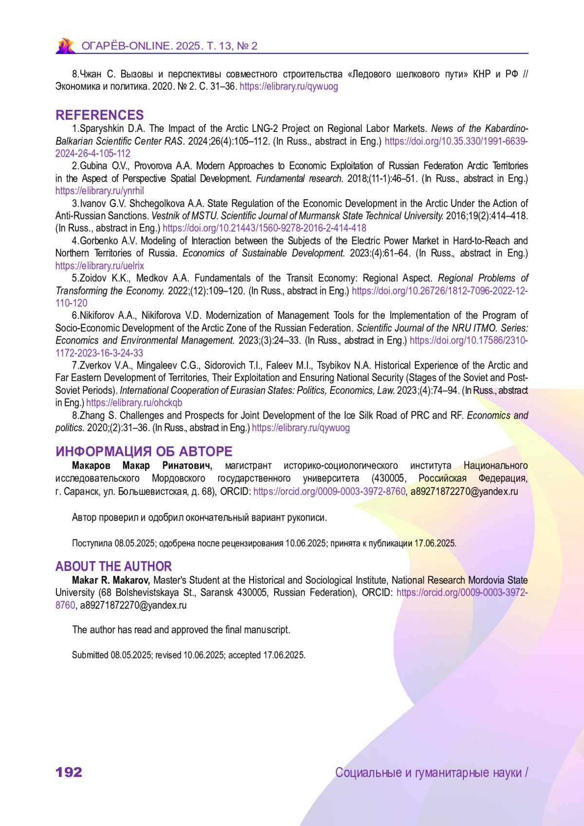 6. Никифоров А. А., Никифорова В. Д. Модернизация инструментов управления реализацией программы социально-экономического развития Арктической зоны РФ // Научный журнал НИУ ИТМО. Серия: Экономика и экологический менеджмент. 2023. № 3. С. 24-33. DOI: 10.17586/2310-1172-2023-16-3-24-33