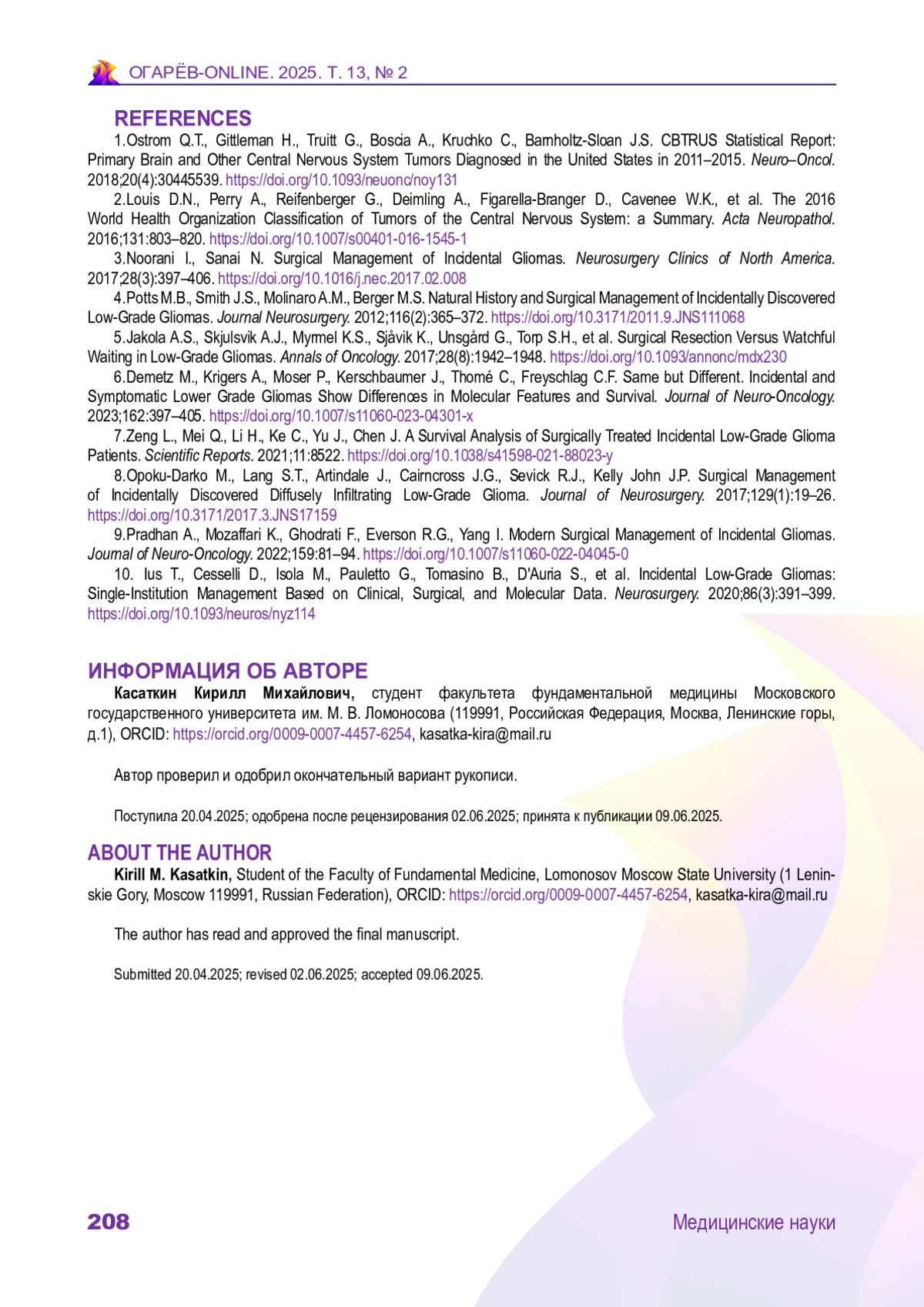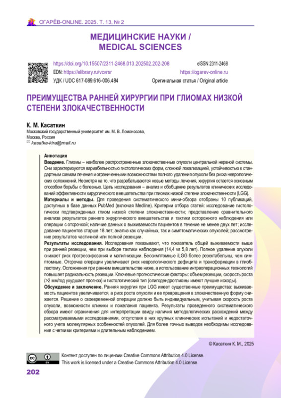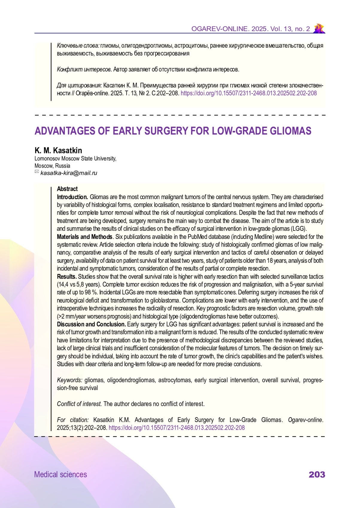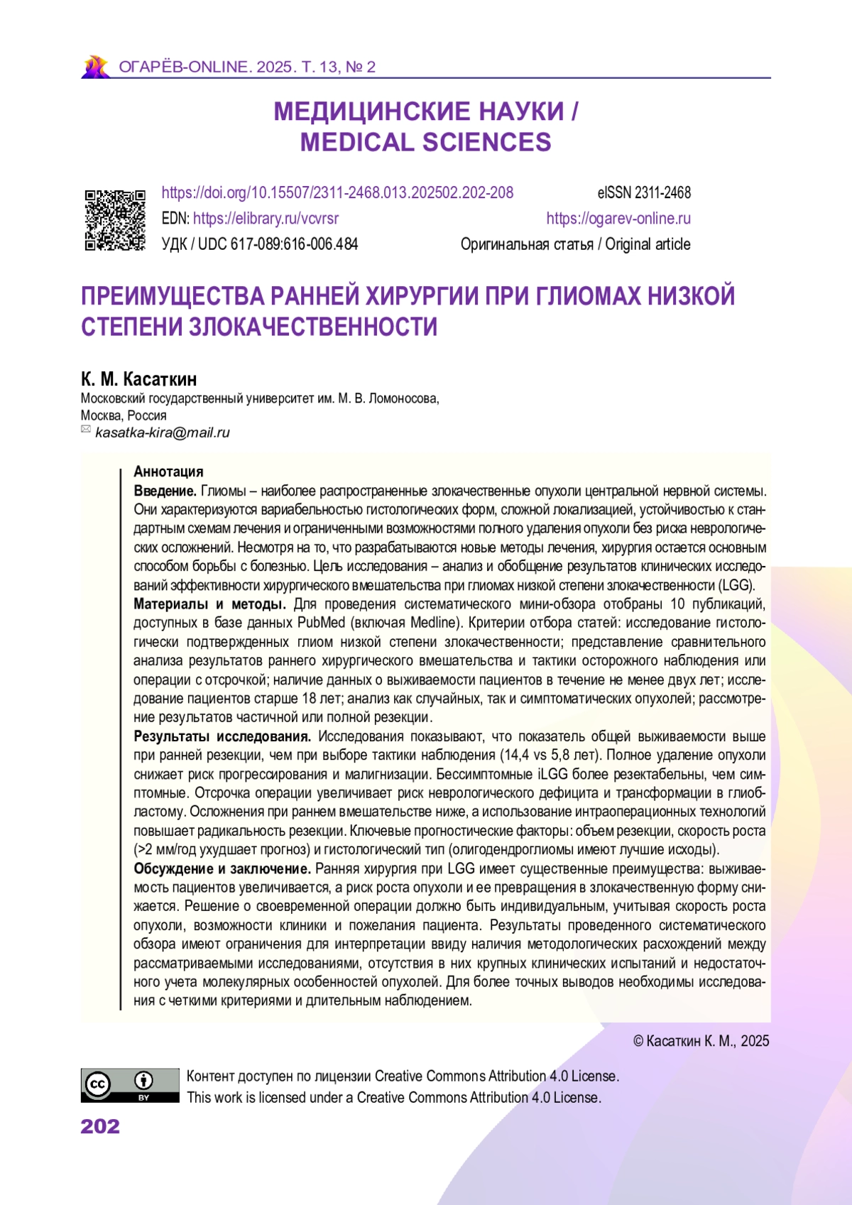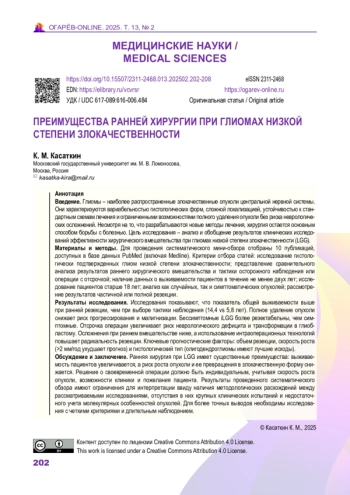 КАСАТКИН К. М. ПРЕИМУЩЕСТВА РАННЕЙ ХИРУРГИИ ПРИ ГЛИОМАХ НИЗКОЙ СТЕПЕНИ ЗЛОКАЧЕСТВЕННОСТИ // ОГАРЁВ-ONLINE. 2025. № 2 (219), ТОМ 13