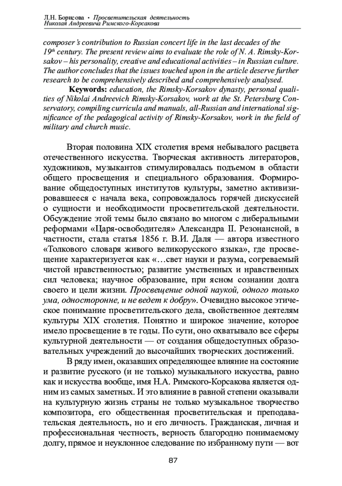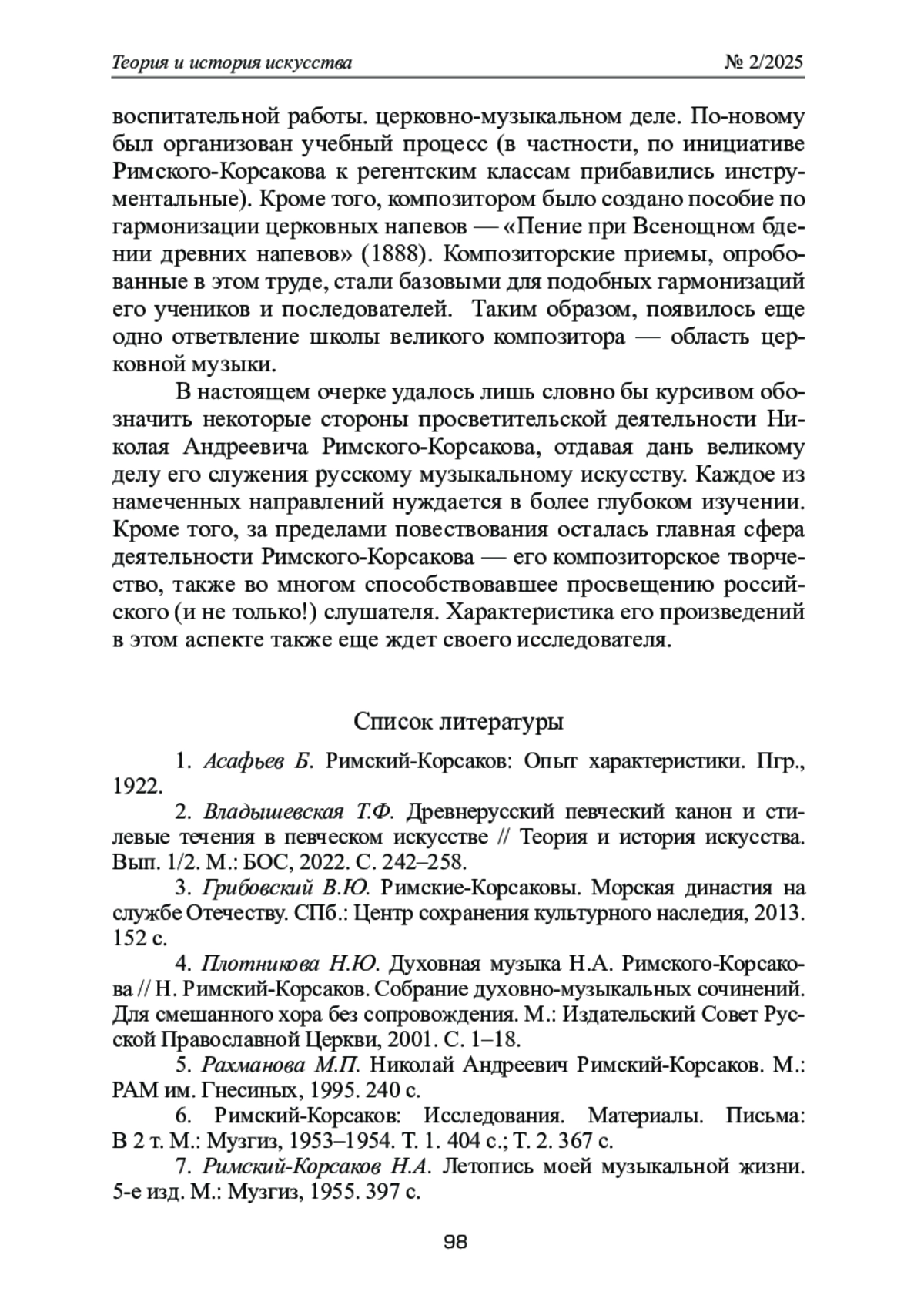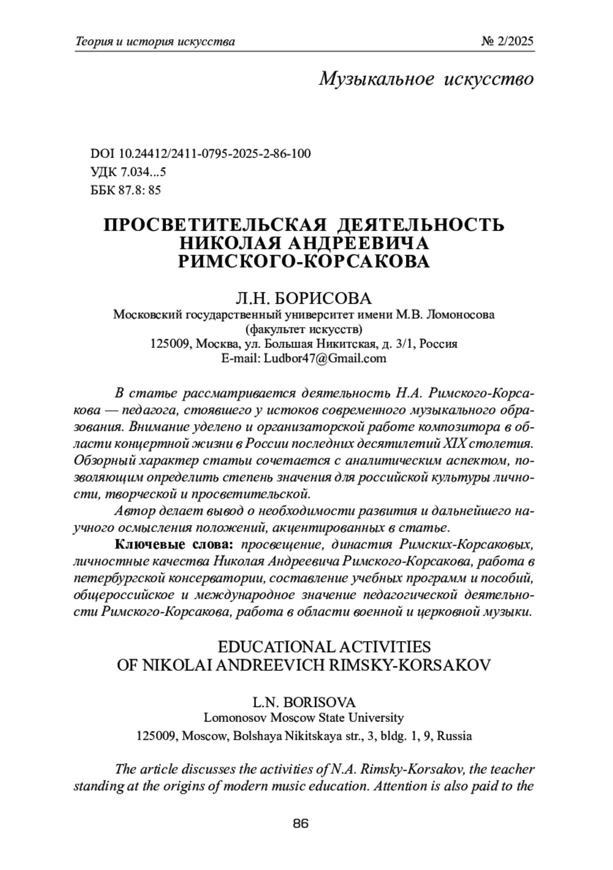 БОРИСОВА Л. Н. ПРОСВЕТИТЕЛЬСКАЯ ДЕЯТЕЛЬНОСТЬ НИКОЛАЯ АНДРЕЕВИЧА РИМСКОГО-КОРСАКОВА // ТЕОРИЯ И ИСТОРИЯ ИСКУССТВА. 2025. № 2