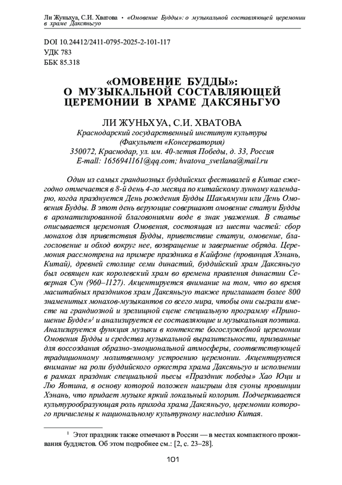 Один из самых грандиозных буддийских фестивалей в Китае ежегодно отмечается в 8-й день 4-го месяца по китайскому лунному календарю, когда празднуется День рождения Будды Шакьямуни или День Омовения Будды. В этот день верующие совершают омовение статуи Будды в ароматизированной благовониями воде в знак уважения. В статье описывается церемония Омовения, состоящая из шести частей: сбор монахов для приветствия Будды, приветствие статуи, омовение, благословение и обход вокруг нее, возвращение и завершение обряда. Церемония рассмотрена на примере праздника в Кайфэне (провинция Хэнань, Китай), древней столице семи династий, буддийский храм Даксяньгуо был освящен как королевский храм во времена правления династии Северная Сун (960‒1127). Акцентируется внимание на том, что во время масштабных праздников храм Даксяньгуо также приглашает более 800 знаменитых монахов-музыкантов со всего мира, чтобы они сыграли вместе на грандиозной и зрелищной сцене специальную программу «Приношение Будде»1 и анализируется ее составляющие и музыкальная поэтика. Анализируется функция музыки в контексте богослужебной церемонии Омовения Будды и средства музыкальной выразительности, призванные для воссоздания образно-эмоциональной атмосферы, соответствующей традиционному молитвенному устроению церемонии. Акцентируется внимание на роли буддийского оркестра храма Даксяньгуо и исполнении в рамках праздник специальной пьесы «Праздник победы» Хао Юци и Лю Яотина, в основу которой положен наигрыш для суоны провинции Хэнань, что придает музыке яркий локальный колорит. Подчеркивается культурообразующая роль прихода храма Даксяньгуо, церемонии которого причислены к национальному культурному наследию Китая