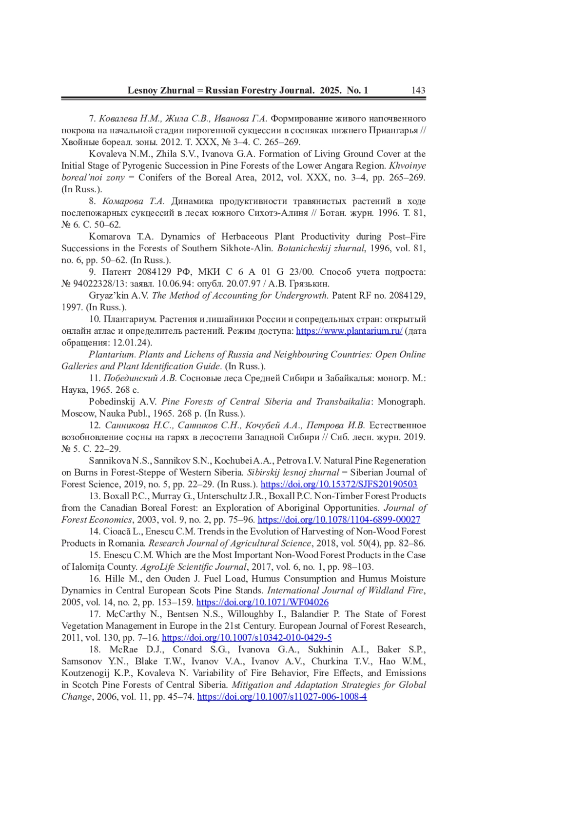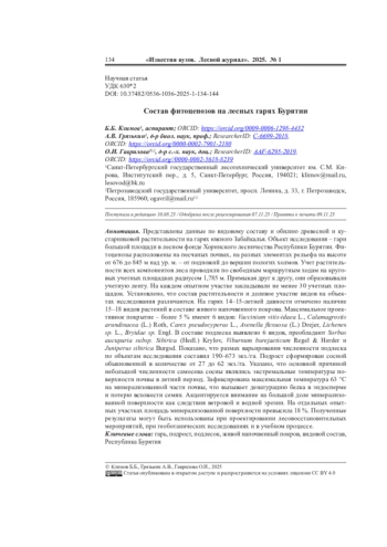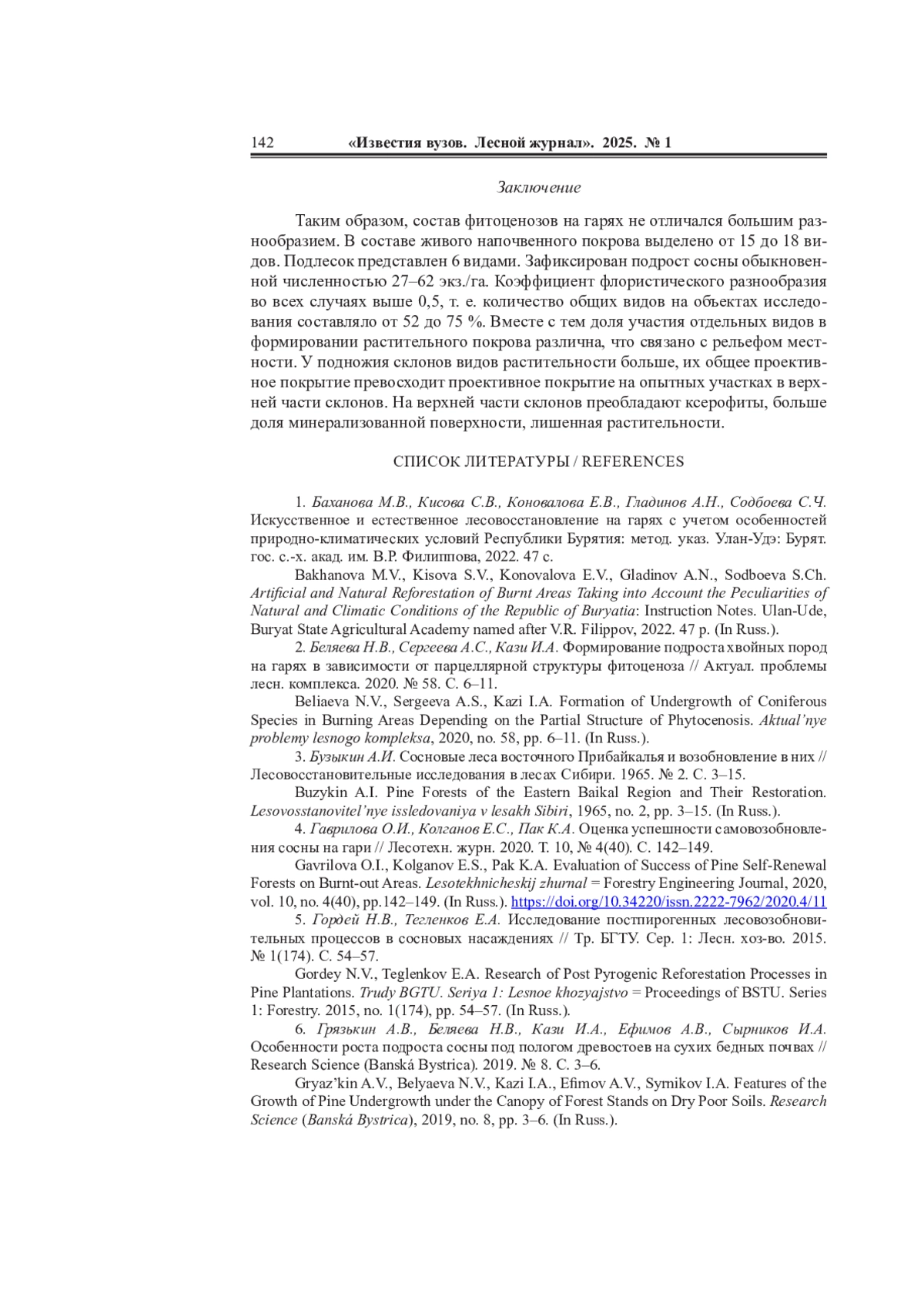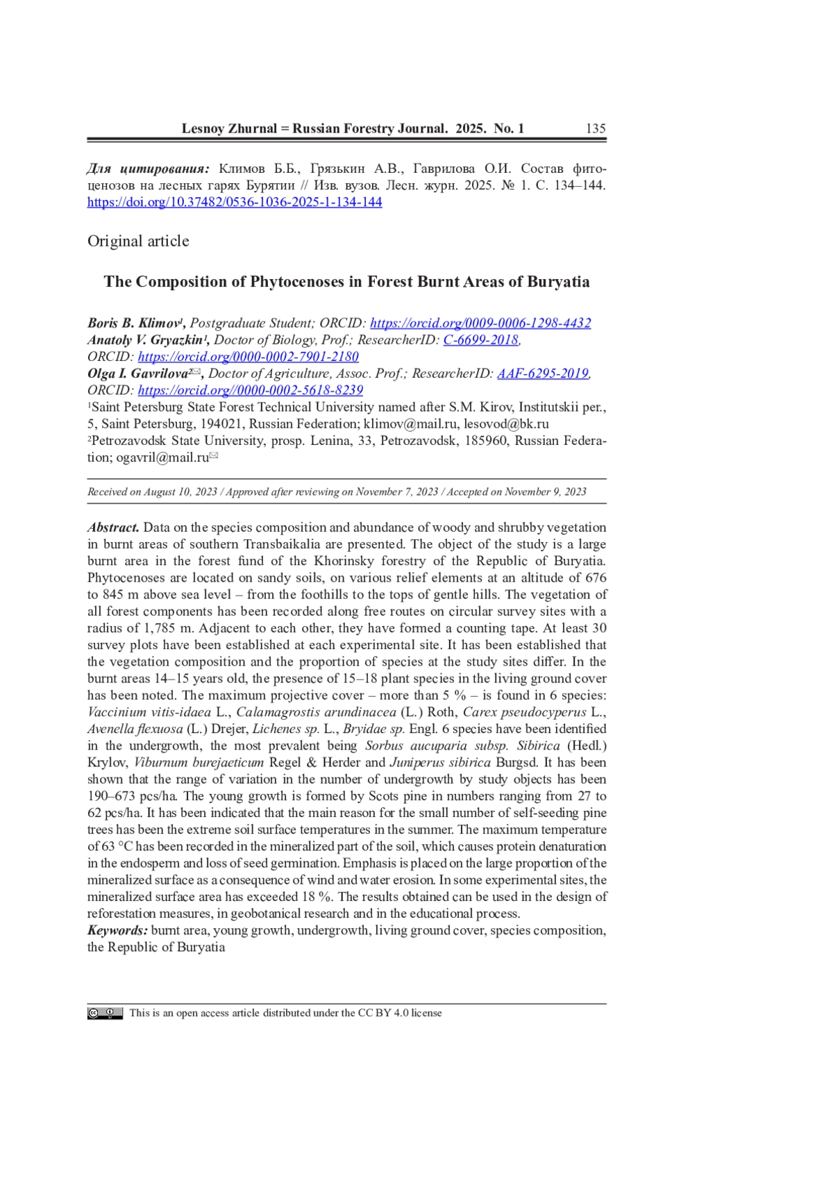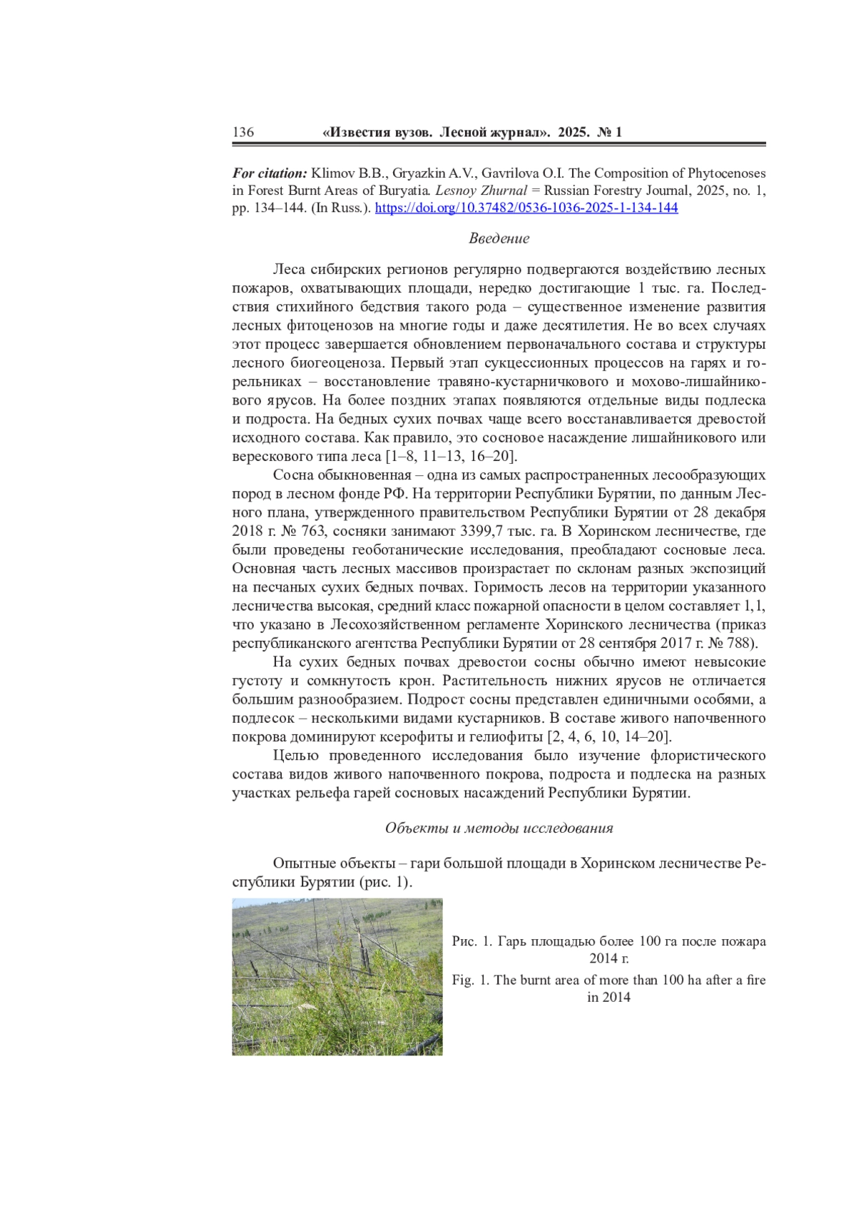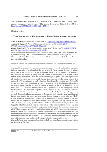 КЛИМОВ Б. Б., ГРЯЗЬКИН А. В., ГАВРИЛОВА О. И. СОСТАВ ФИТОЦЕНОЗОВ НА ЛЕСНЫХ ГАРЯХ БУРЯТИИ // ИЗВЕСТИЯ ВЫСШИХ УЧЕБНЫХ ЗАВЕДЕНИЙ. ЛЕСНОЙ ЖУРНАЛ. 2025. № 1 (403)